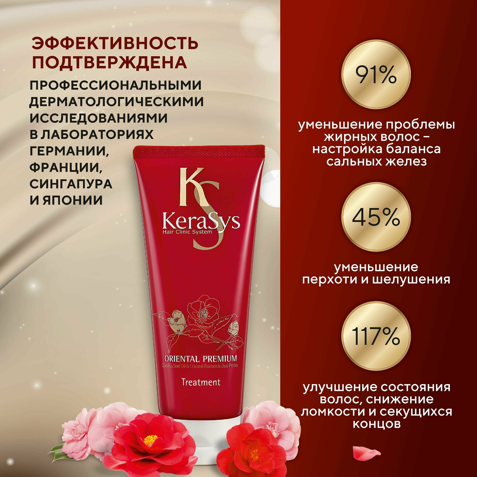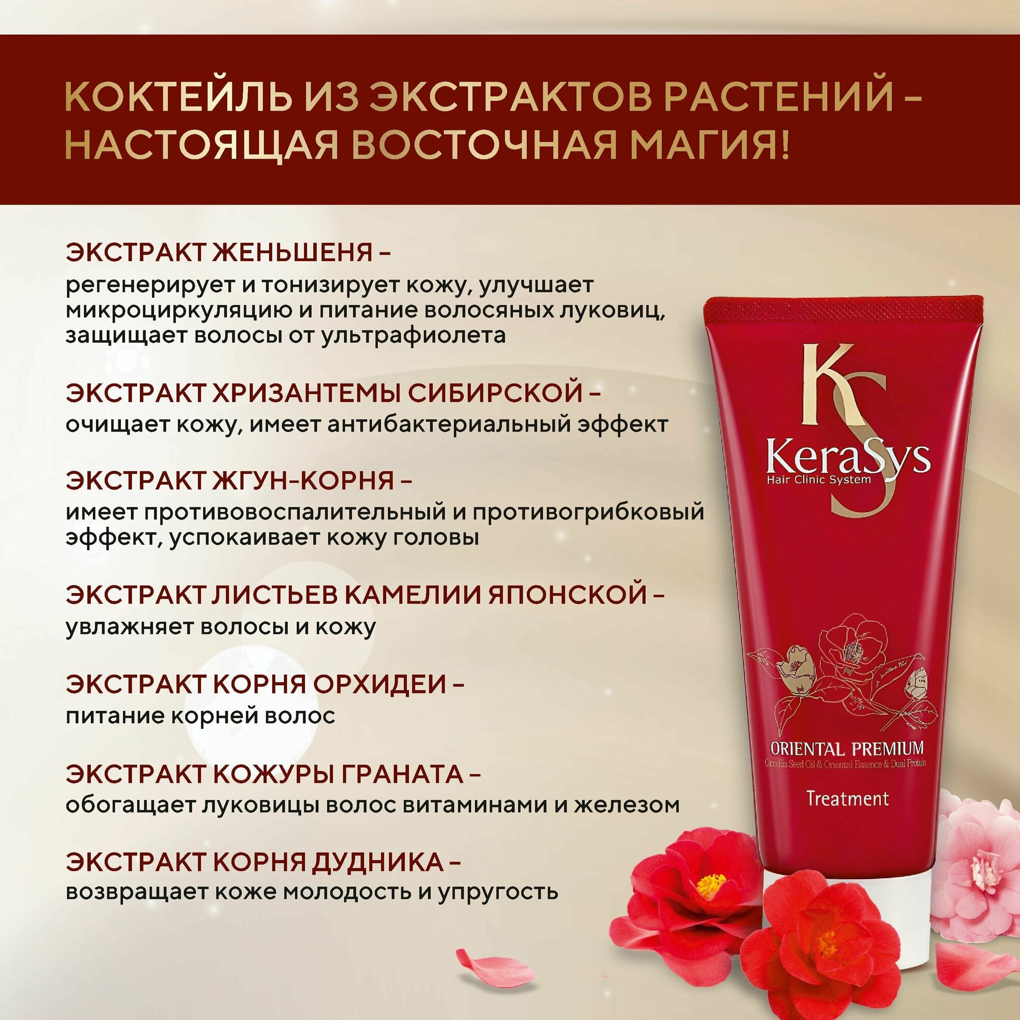 Данная маска предназначена для ухода за волосами всех существующих типов, включая ослабленные и поврежденные. Ее использование позволяет обрести волосам жизненную силу, эластичность, блеск и надежную защиту от вредного влияния солнечных лучей, чему наилучшим образом способствуют входящие в ее состав активные компоненты. За счет масла камелии, обладающего способностью глубоко проникать в структуру волосяного стержня и питать корневую луковицу, маска превосходно восстанавливает и укрепляет хрупкие и ломкие волосы, существенно усиливает защиту волос, помогая им становиться эластичными и блестящими от корней до кончиков. Содержание в маске кератинового комплекса (концентрация кератина 2,5 раза выше, чем у кондиционера) позволяет заботиться о поврежденных волосах, насыщая их необходимыми питательными веществами и разглаживая. Присутствие в составе композиции из 6 традиционных восточных растений (листьев камелии, граната, ангелики, орхидеи, жгун-кореня, женьшеня) способствует укреплению корней волос и предотвращению их преждевременного выпадения. Продукт подвергался клиническим испытания в институтах дерматологии США и Германии, доказав свою высокую эффективность в процессе использования, и способен в домашних условиях обеспечить профессиональный уход за волосами.
