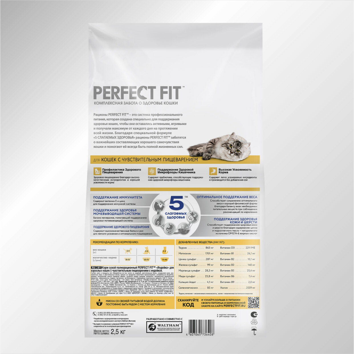 Perfect Fit Sensitive – рацион, адаптированный специально для кошек с особенностями пищеварения. Он содержит пребиотики, способствующие поддержанию здоровой микрофлоры кишечника, и не содержит пшеницы и сои, которые могут вызвать дискомфорт в желудке кошки.Корм предназначен для кошек в возрасте от 1 до 7 лет: Для кошек массой 3 кг – 45 грамм корма в день Для кошек массой 4 кг – 55 грамм корма в день Для кошек массой 5 кг – 60 грамм корма в день Миска со свежей питьевой водой должна постоянно быть рядом с местом кормления.Хранить при температуре от + 4°С до + 35°С и относительной влажности воздуха не более 75 %.