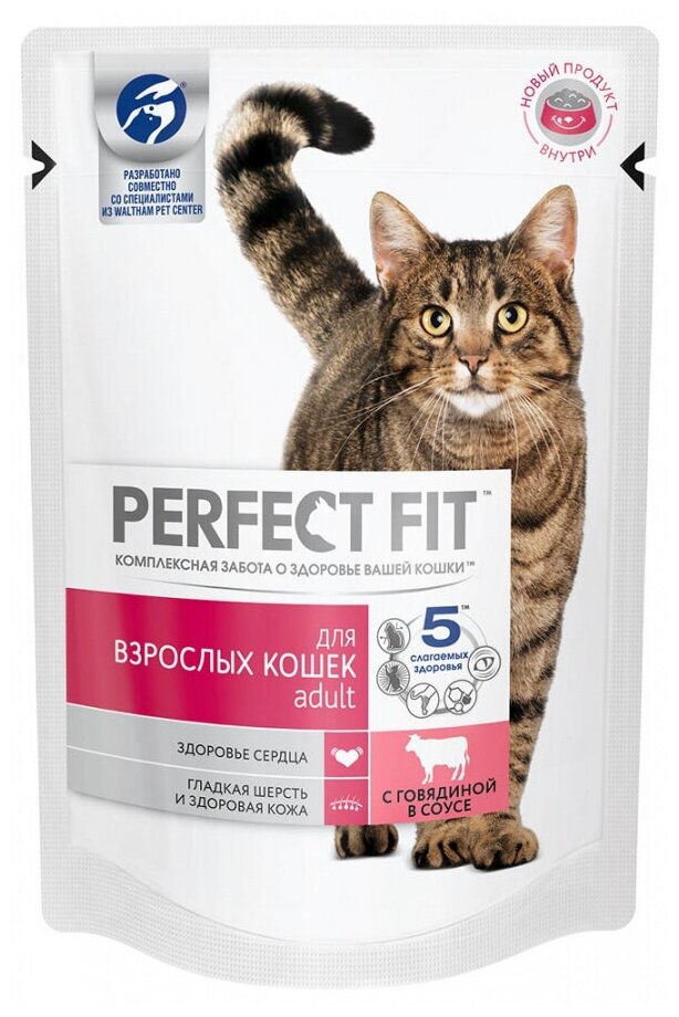 В Perfect Fit Adult мы учли все потребности взрослых кошек, которым важно оставаться в тонусе. Комбинация белков, минералов и витаминов поддержит силу мышц и подарит кошке энергию для активного времяпрепровождения, а Омега – 6 жирные кислоты и цинк поддержат здоровье кожи и шерсти вашего питомца.Вашу кошку следует кормить кормом комнатной температуры. Для взрослой кошки среднего веса (4кг) необходимо 3-4 пакетика в день.Хранить при температуре от +4 до +35 ?C и относительной влажности воздуха не более 75%