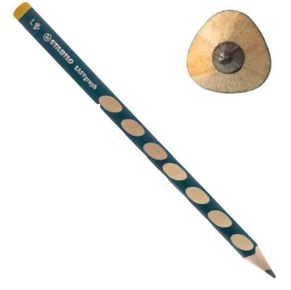 Чернографитный карандаш для левшей. Специальные углубления на корпусе карандаша, адаптированные для левшей, предотвращают скольжение пальцев при письме и фиксируют их в правильном положении. Это позволяет свести к минимуму необходимые усилия для удержания карандаша в руке. Специальная маркировка L на корпусе и желтый цвет торца позволяют легко определить принадлежность для леворуких. Утолщенный грифель карандаша отличается особой яркостью и стойкостью к поломкам. Твердость НВ.