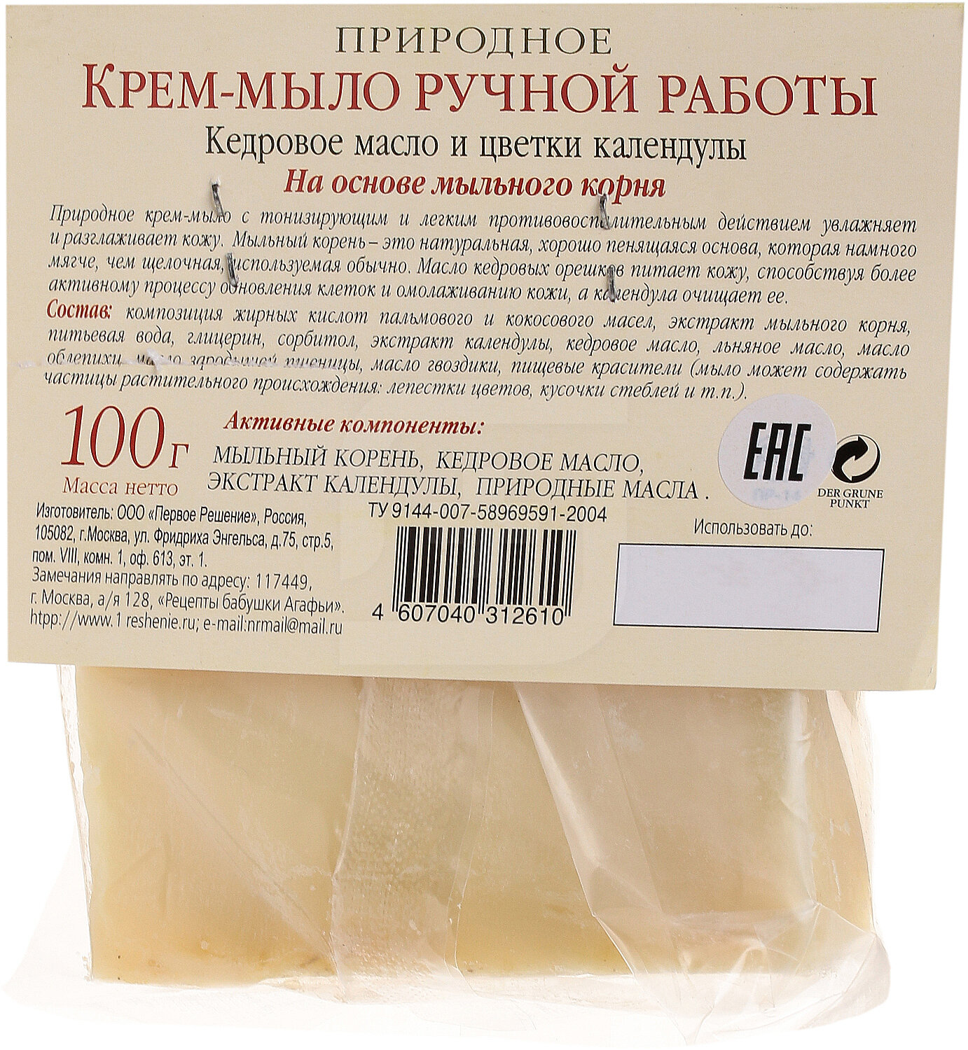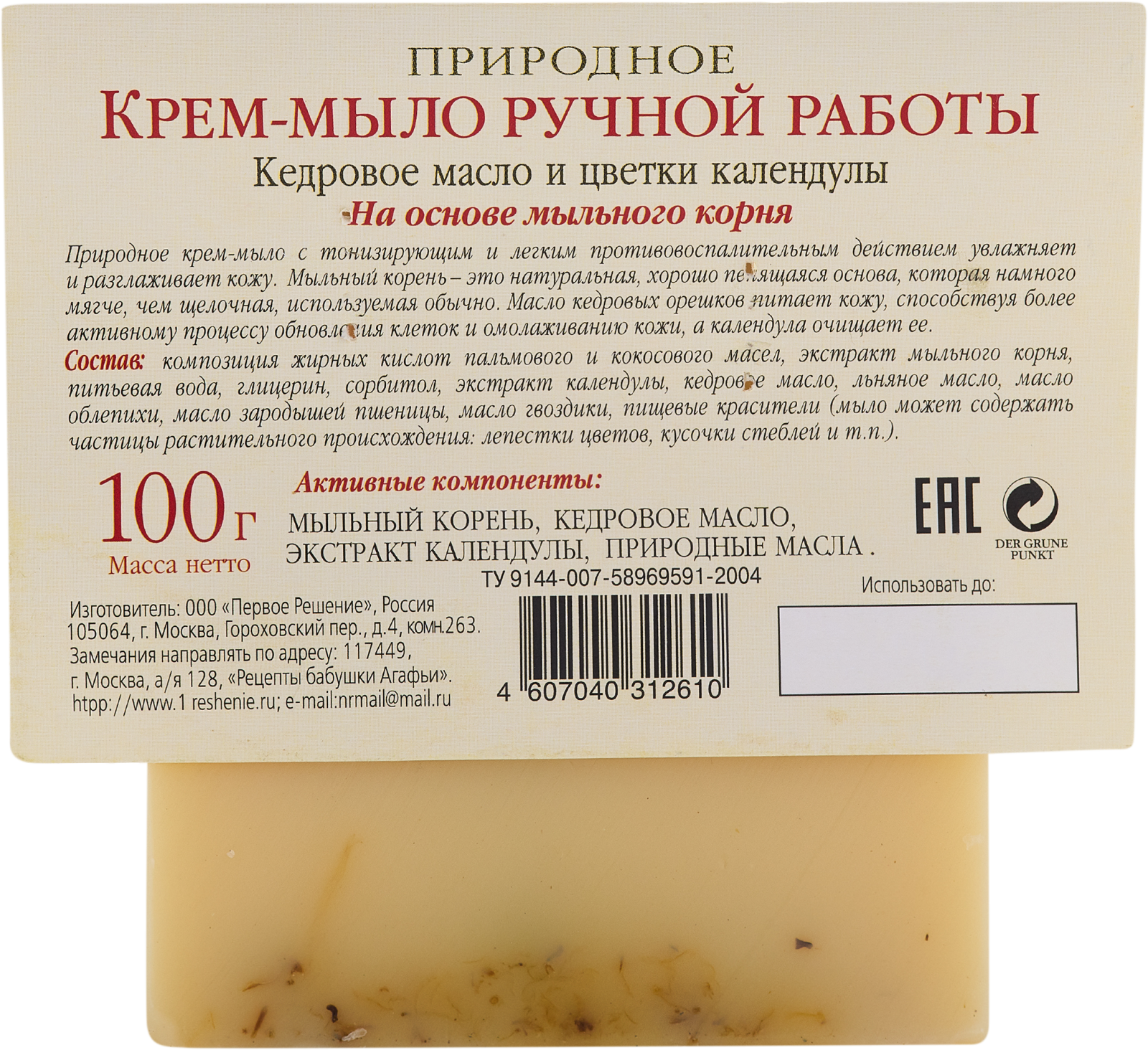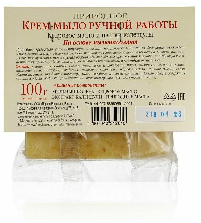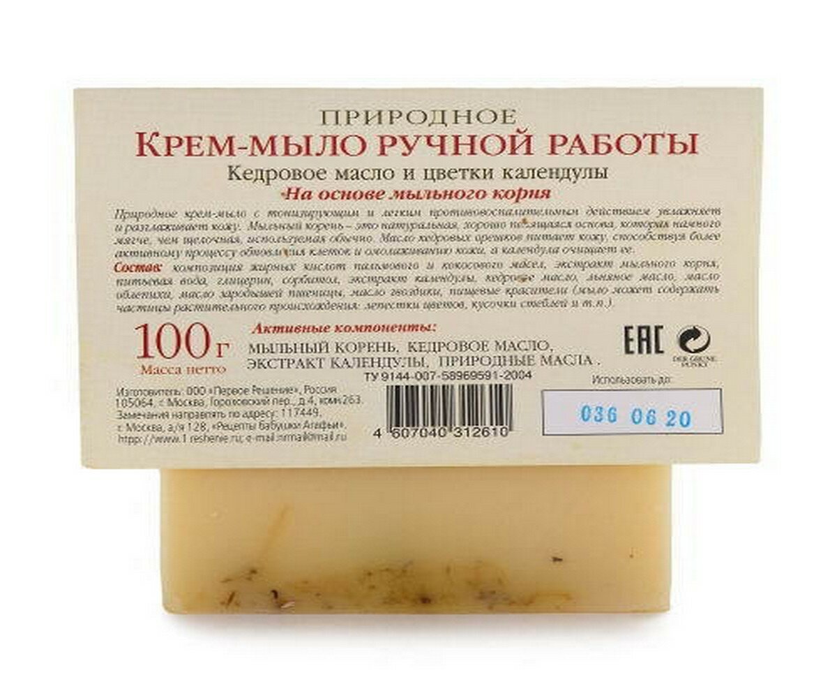 | Состав | Композиция жирных кислот пальмового и кокосового масел, экстракт мыльного корня, питьевая вода, глицерин, сорбитол, экстракт календулы, кедровое масло, льняное масло, масло облепихи, масло зародышей пшеницы, масло гвоздики, пищевые красители(мыло может содержать частицы растительного происхождения |