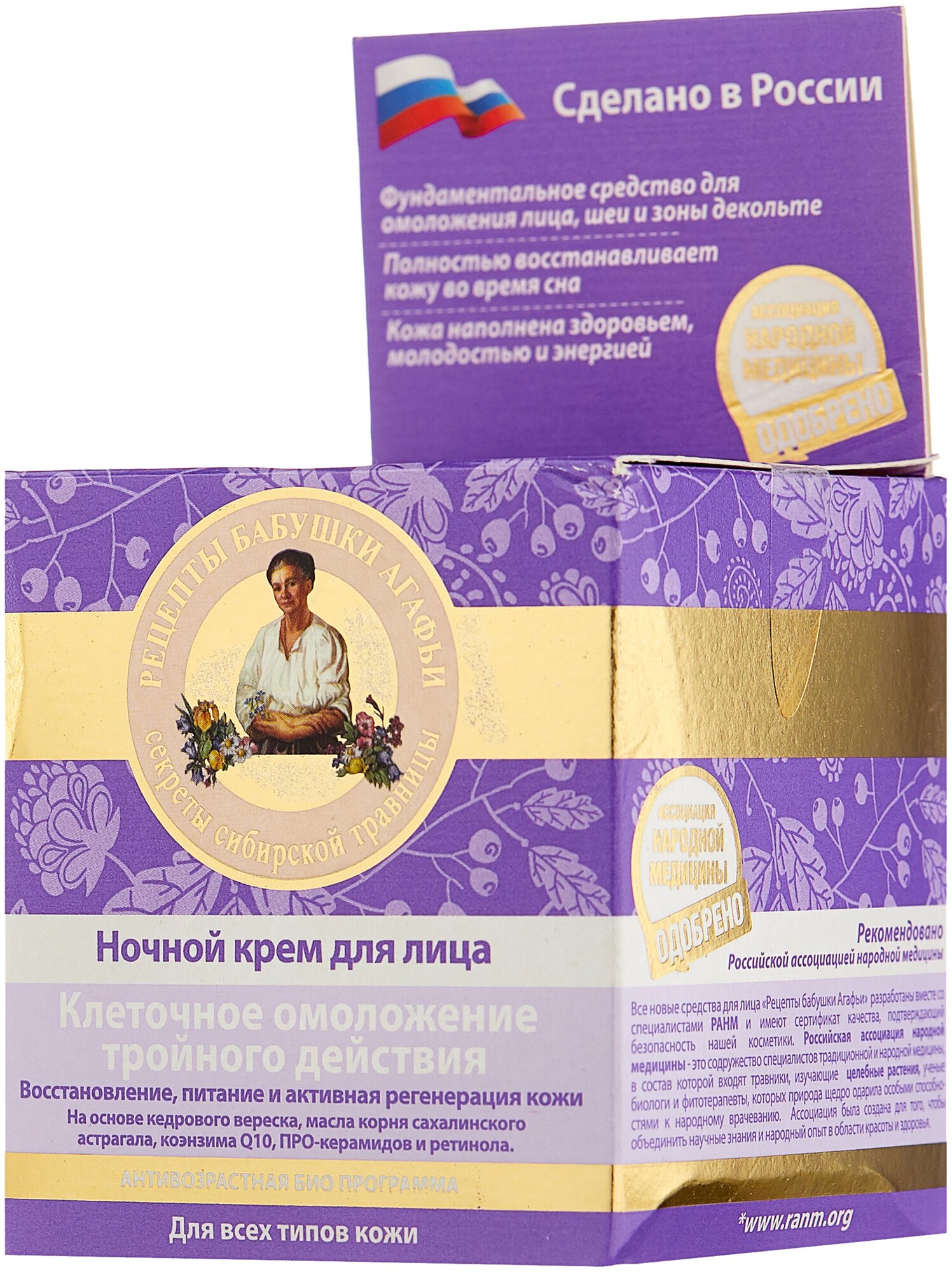 Данный ночной крем создан по рецептам сибирской травницы Агафьи и содержит хорошо сбалансированный комплекс активных веществ, наделяющих его способностью эффективно действовать на клеточном уровне, активно насыщая ее питательными веществами и восстанавливая во время сна. Благодаря кедровому вереску, богатого на дубильные вещества и органические кислоты, крем превосходно повышает тонус и успокаивает кожу, тогда как коэнзим Q10 оказвает на нее мощное восстанавливающее и омолаживающее воздействие, придает эластичность и упругость. Присутствие в составе масла корня сахалинского астрагала, имеющего высокую концентрацию эфирных масел, органических кислот и флавоноидов, превосходно смягчает и успокаивает кожу, помогает ей освободиться от накопленного напряжения. За счет содержания прокерамидов и ретинола крем глубоко питает и разглаживает кожу, сокращает мелкие и глубокие морщины.