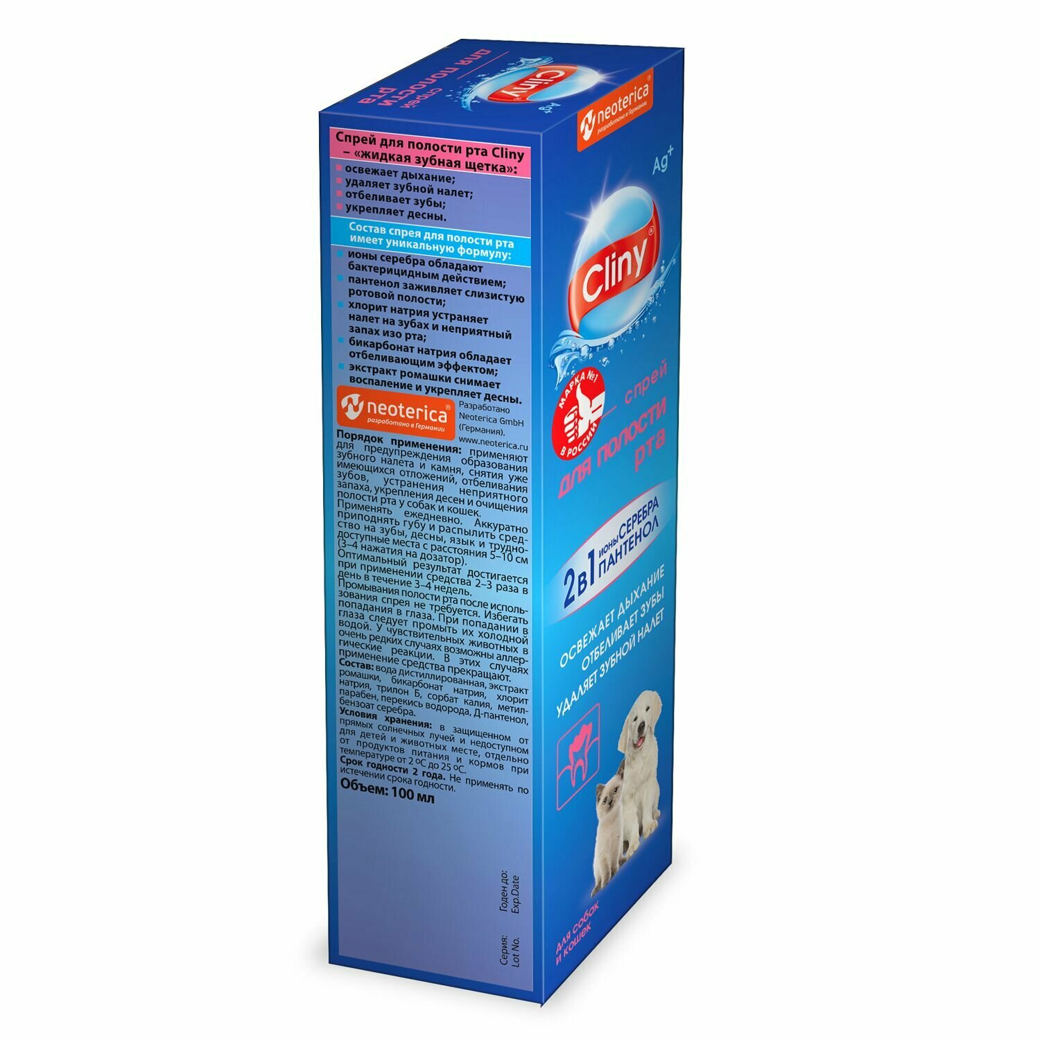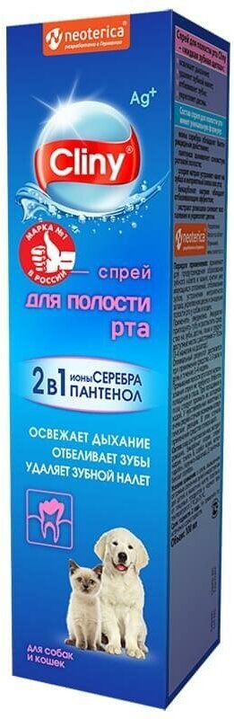 Спрей для полости рта Cliny: освежает дыхание устраняет зубной налет отбеливает зубы укрепляет десны. Подходит для применения как собакам, так и кошкам. ПОКАЗАНИЯ: Средство Спрей для полости рта Cliny применяют для предупреждения образования зубного налета и зубного камня, снятия уже имеющихся отложений, отбеливания зубов, устранения неприятного запаха, укрепления десен и очищения полости рта у собак и кошек. Спрей для полости рта Cliny не содержит элементов опасных для здоровья животного, промывать полость рта после применения препарата не нужно. ПОРЯДОК ПРИМЕНЕНИЯ: Применяют ежедневно методом опрыскивания зубов и десен. Аккуратно приподнять губу и опрыскать зубы и десна с расстояния 5-10 см (3-4 нажатия на дозатор). Максимальный результат достигают при применении препарата 2-3 раза в день в течение трех-четырех недель. Избегать попадания в глаза. При попадании в глаза следует промыть их холодной водой. ПРОТИВОПОКАЗАНИЯ: У чувствительных животных возможны аллергические реакции. В этих случаях применение средства прекращают. СОСТАВ: Экстракт ромашки, хлорит натрия, бикарбонат натрия, трилон Б, сорбат калия, метилпарабен, перекись водорода, бензоат серебра, вода дистиллированная. УСЛОВИЯ ХРАНЕНИЯ: Хранят средство в закрытой упаковке производителя, в сухом, защищенном от прямых солнечных лучей месте, отдельно от пищевых продуктов и кормов, при температуре от 2 oС до 25 oС. Средство следует хранить в местах, недоступных для детей и домашних животных. Не применять по истечении срока годности. Срок годности 3 года. Гигиенические средства серии Cliny созданы с учетом потребностей и анатомических особенностей животных. Вместе с Cliny владельцы получают простой и удобный способ содержать питомца в чистоте. Cliny – это первая серия по уходу за животными с ионами серебра. Доказано, что ионы серебра обладают мощным бактерицидным действием широкого спектра, не вызывая аллергии и интоксикаций. Кроме того, серебро - микроэлемент, необходимый для нормального функционирования внутренних органов и систем организма, повышающий иммунитет животного.