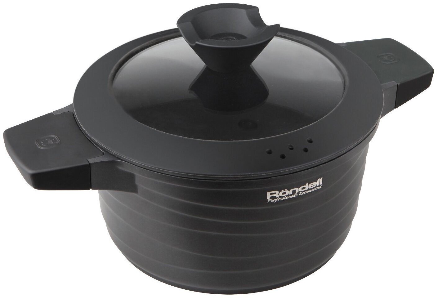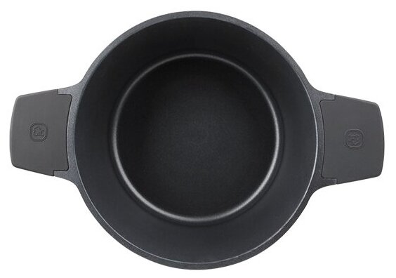 Крышка, выполненная из термостойкого стекла, имеет силиконовый обод, который позволяет крышке бесшумно закрываться и предотвращает сколы при падении. Отверстия разного размера на ободе крышки предназначены для удобного слива жидкости. Кастрюля снабжена бакелитовыми ручками с покрытием Soft-touch.