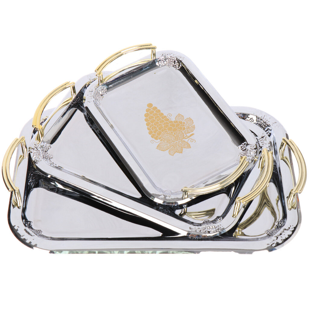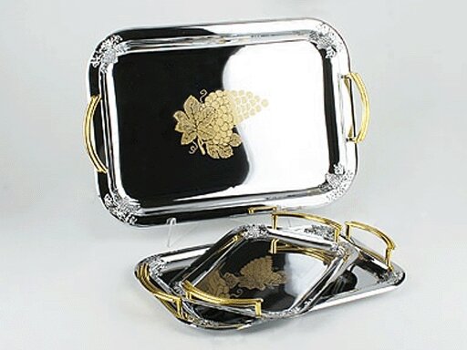 Набор из трех сервировочных подносов разного размера, изготовленных из нержавеющей стали с зеркальной полировкой, станет незаменимым предметом для сервировки стола. Они имеют прямоугольную форму и оформлены декоративными элементами и ручками золотистого цвета.Подносы отлично подойдут для подачи рыбных блюд, а традиционные блюда будут выглядеть на них более аппетитно. Благодаря оригинальному дизайну сервировочные подносы придадут элегантный вид любому обеденному столу.Современный стильный дизайн и функциональность позволят подносам занять достойное место на Вашей кухне.