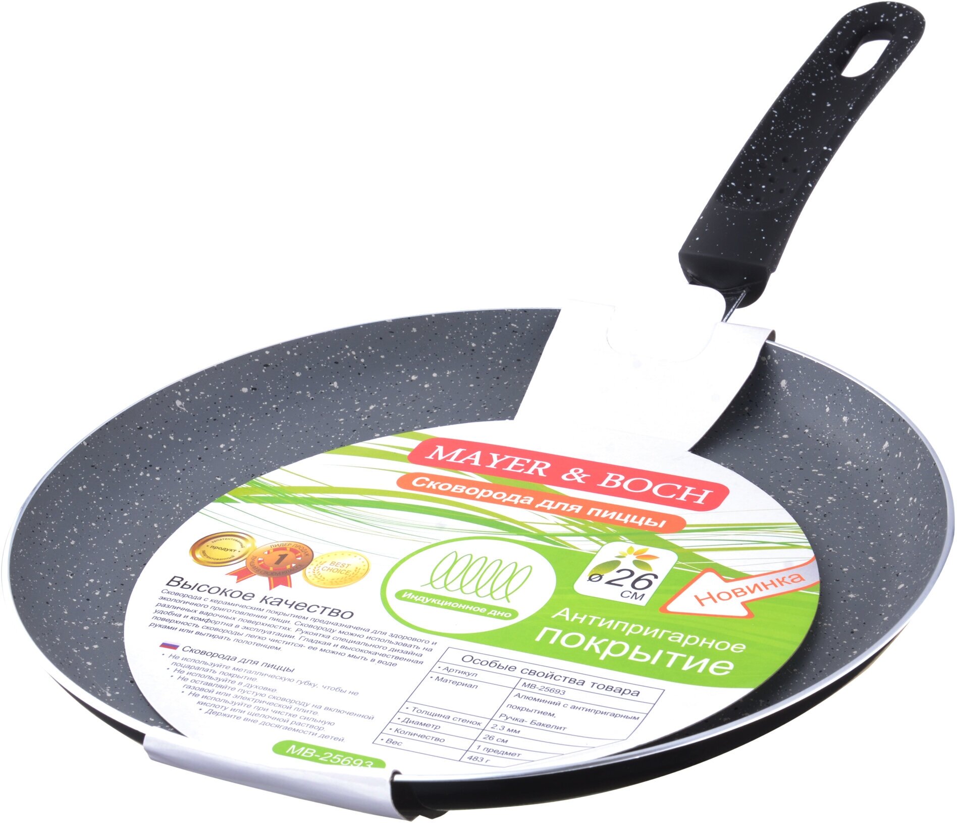 Блинная сковорода MAYER&BOCH выполнена из качественного алюминия и снабжена внутренним мраморным антипригарным покрытием. Антипригарное покрытие жаропрочное, является экологически чистым и полностью безопасным, без вредных соединений и примесей. За счет того, что пища не пригорает и не пристает к покрытию сковороды, сковороду легко и быстро мыть. Прочное индукционное дно сковороды устойчиво к повреждениям и деформации. Эргономичная ручка из бакелита не нагревается и не скользит в руках. Такая сковорода является незаменимой для выпечки блинов и оладий, яичницы и т.п. Подходит для использования на всех типах плит, включая индукционные. Подходит для мытья в посудомоечной машине. Не использовать в духовом шкафу. Не применять абразивные моющие средства и губки для мытья посуды.