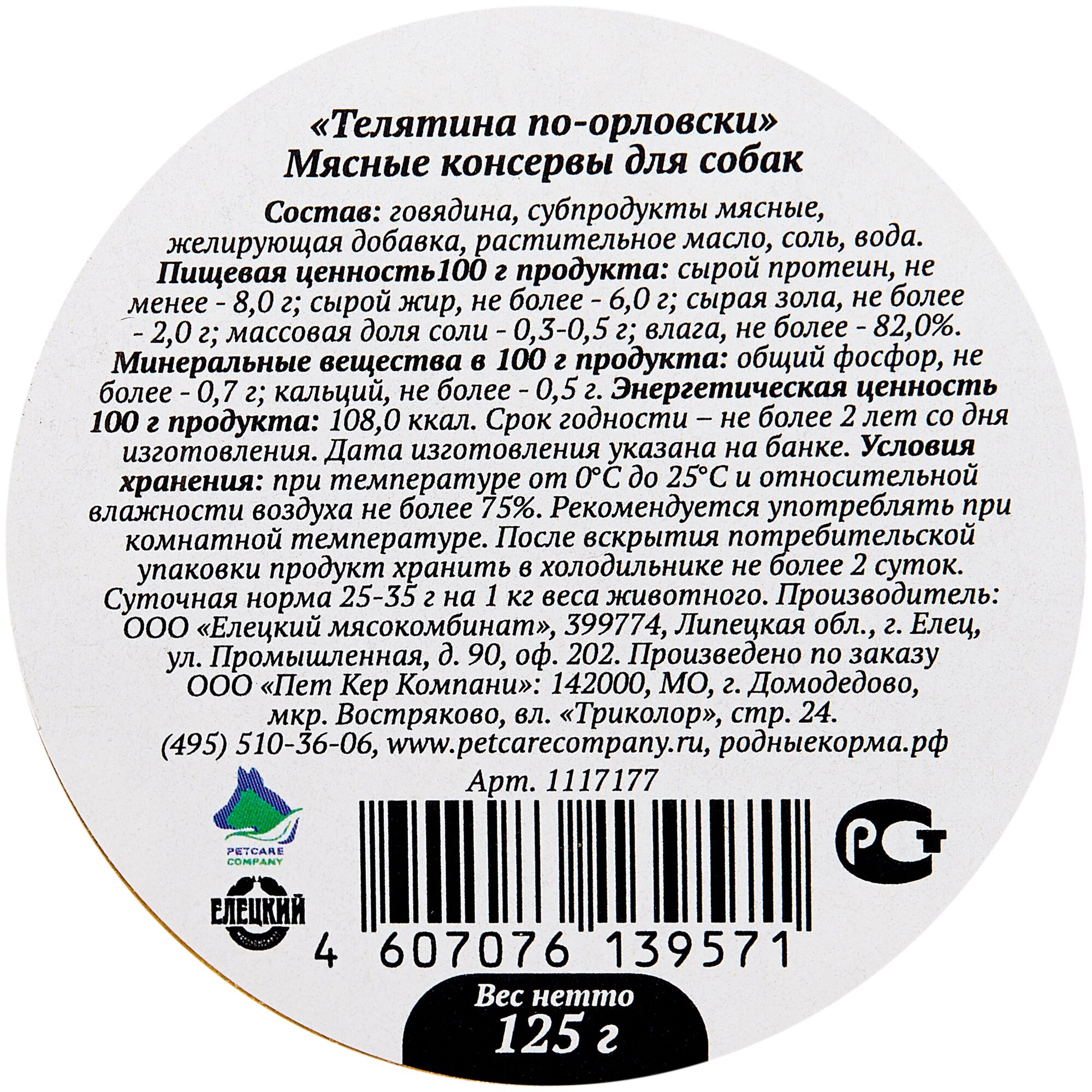 Влажный корм Родные корма Елец для взрослых собак телятина по орловски 125г по-орловски