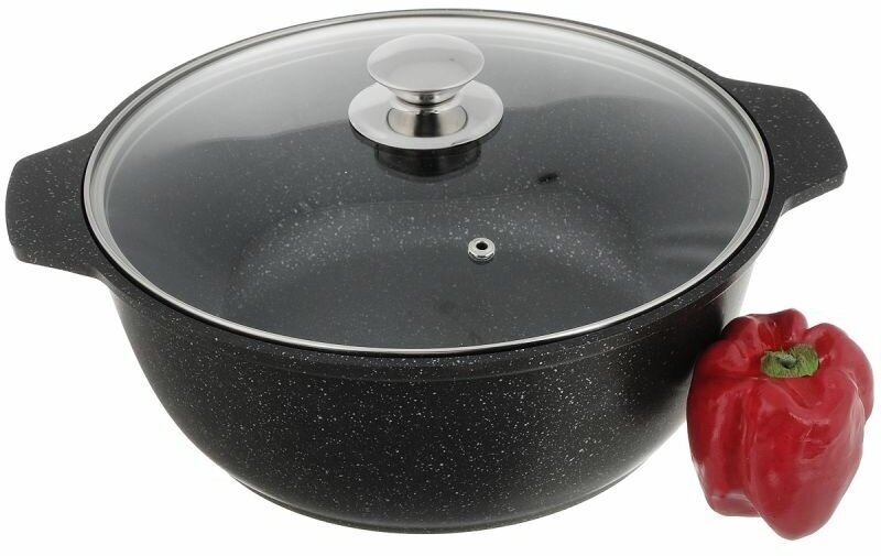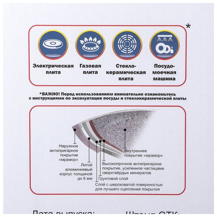 Значительная толщина стенок и дна исключает деформацию корпуса изделий, гарантирует долговечность посуды, обеспечивает необходимую прочность покрытия. Инновационное антипригарное мраморное покрытие разработано в соответствии с высокими европейскими стандартами безопасности и экологии. В состав покрытия входят частицы каменной породы, которые обеспечивают исключительную прочность и твердость покрытия. Возможность приготовления вкусной и здоровой пищи без добавления масла, как на раскаленных камнях. Удобство в использовании: легкость мытья и очистки. Высокоэффективное распределение и сохранение тепла. Пища не пригорает, быстро и легко готовитс