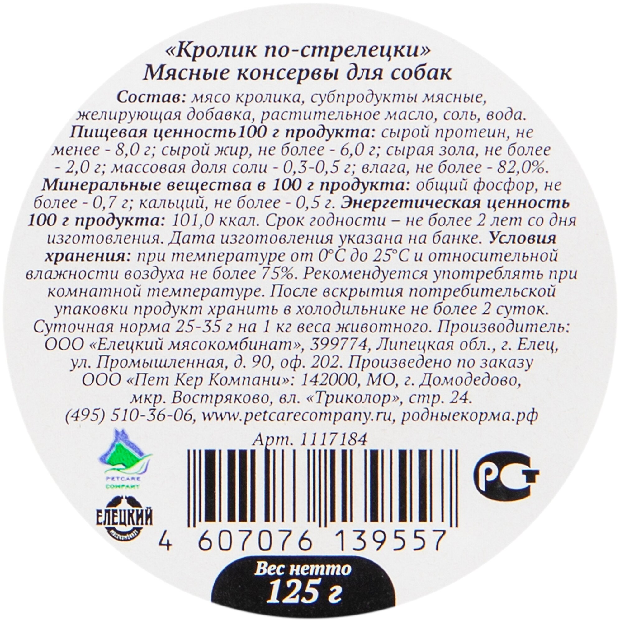 Влажный корм Родные корма Елец для взрослых собак кролик по стрелецки 125г по-стрелецки