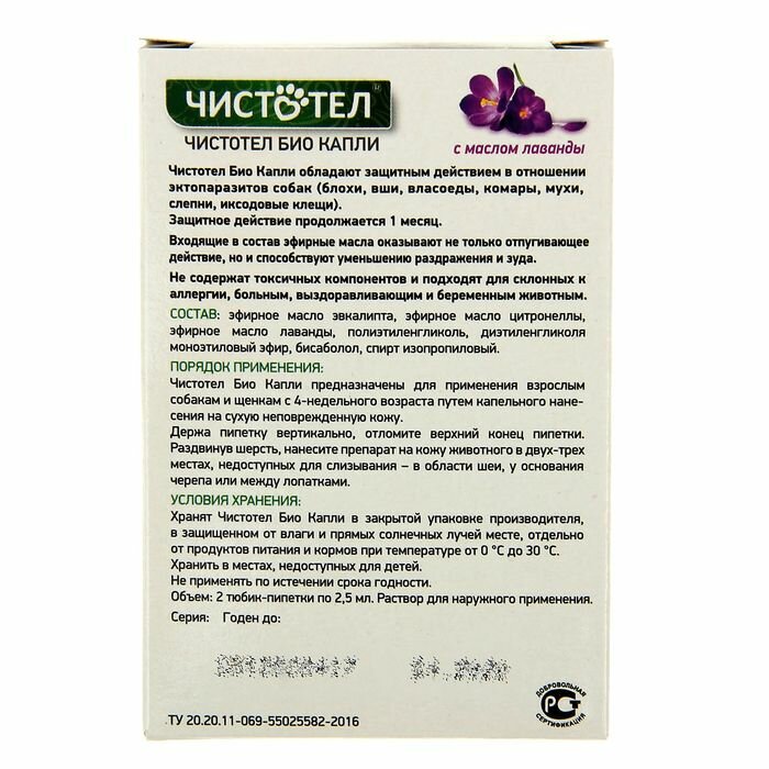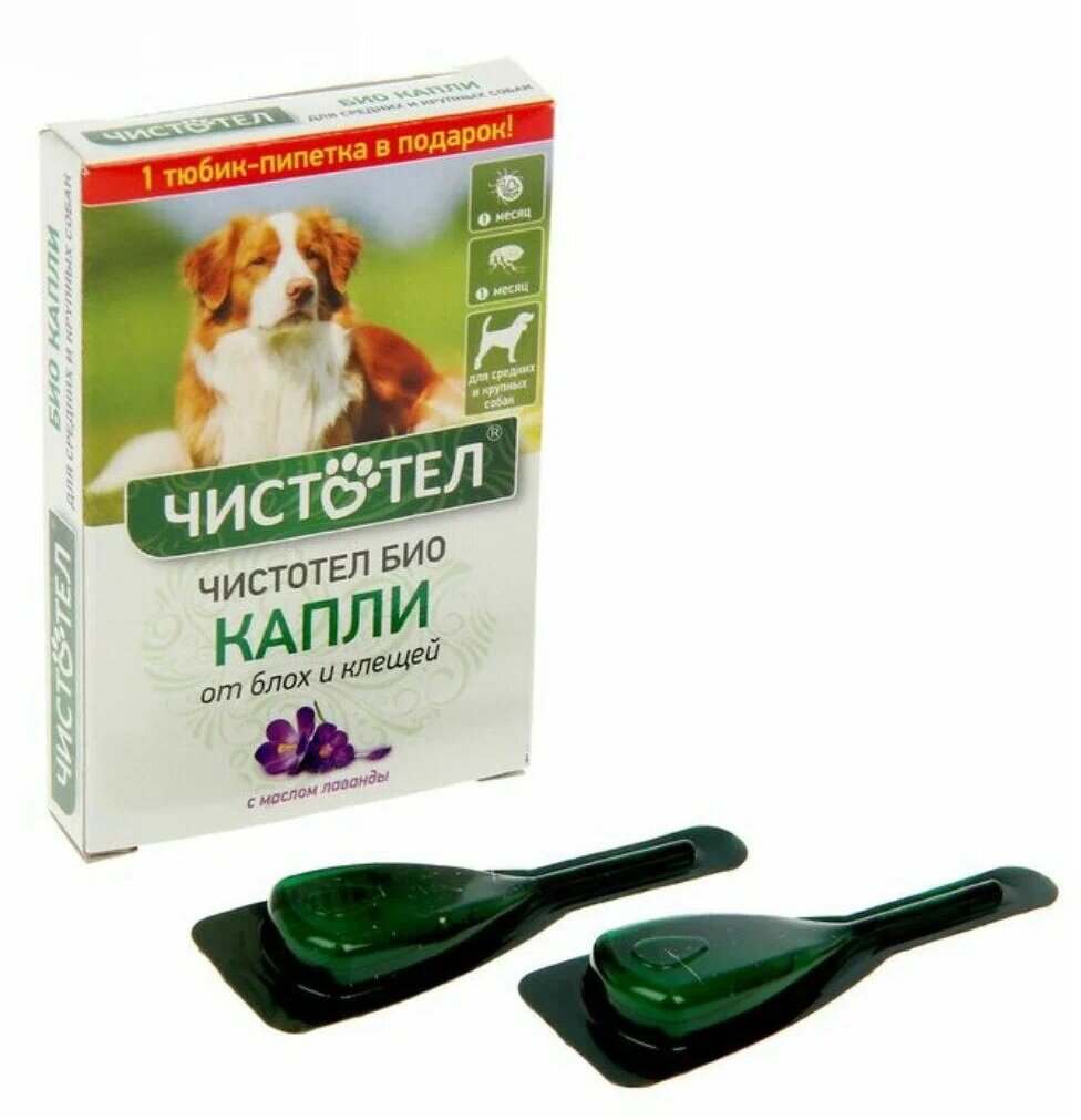 Средство Чистотел Био Капли обладает защитным действием в отношении эктопаразитов собак (блохи, вши, власоеды, комары, мухи, слепни, иксодовые клещи). Защитное действие продолжается 1 месяц.