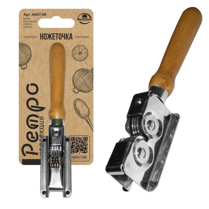 Ручная ножеточка «Ретро» используется для заточки ножей и ножниц в домашних условиях. Приспособление имеет простую конструкцию — состоит из дисков, между которыми протягивается лезвие во время заточки. Края дисков срезают тонкий слой металла, за счет чего полотно становится острым.