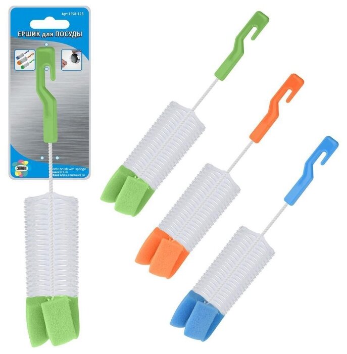 Необходимый аксессуар на кухне - ершик для мытья посуды, особенно изделий с узким горлышком: бутылок, ваз для цветов, узких бокалов, банок, кружек и др. Без него невозможно добраться до донышка, а при наличии ершика «Комби» в хозяйстве вы легко справитесь с этой задачей - мягкая губка отмоет донышко до блеска и без единой царапины. Изготовлено: рабочая часть из синтетической щетины и пенополиуретана, ручка комбинированная из металлической проволоки и пластика.
