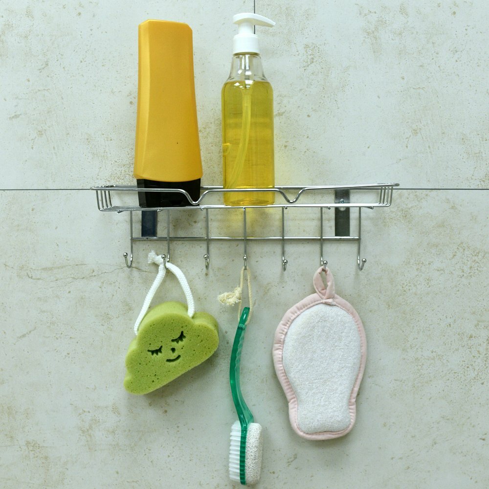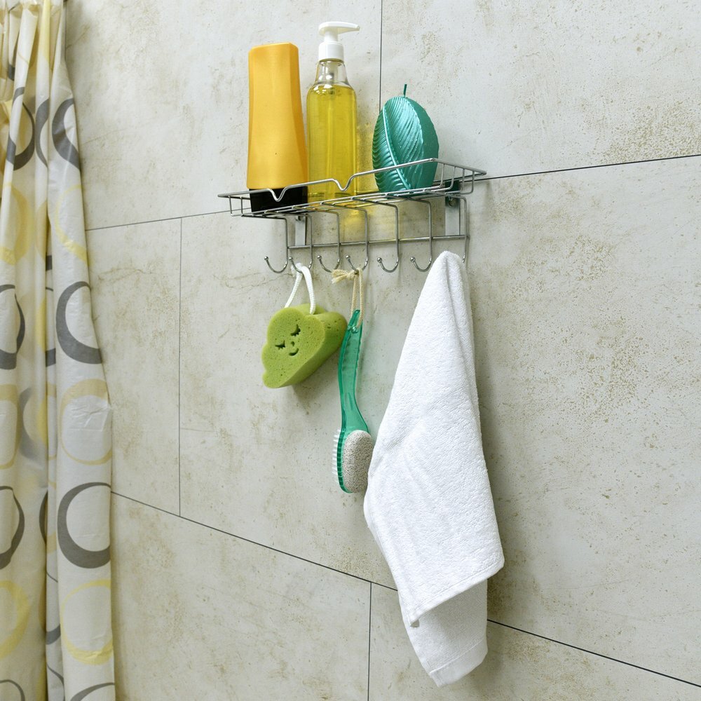Удобная полка с 7 крючками — универсальное приспособление для ванной комнаты и кухни. Позволяет разместить моющие средства, мочалки, губки, щетки, развесить полотенца, прихватки, кухонную утварь и другие принадлежности. С этим изделием домашние мелочи всегда будут под рукой и содержаться в порядке. Полка крепится на шурупы к вертикальной поверхности, изготовлена из стальной хромированной проволоки, привлекательно смотрится в любом интерьере. При появлении загрязнений протирайте изделие влажной тряпкой. Подойдет для любой кухни или ванной комнаты, занимает мало места.