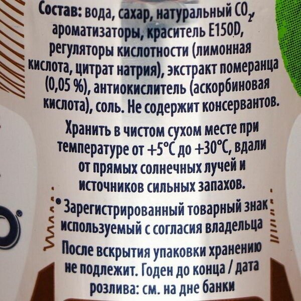 | Состав | вода, сахар, натуральный СО2, ароматизаторы, краситель Е150D, регуляторы кислотности (лимонная кислота, цитрат натрия), экстракт померанца (0,05 %), антиокислитель (аскорбиновая кислота), соль. Не содержит консерванто |
