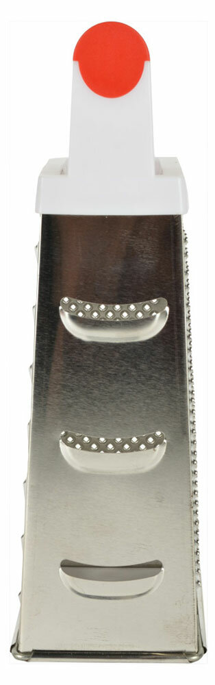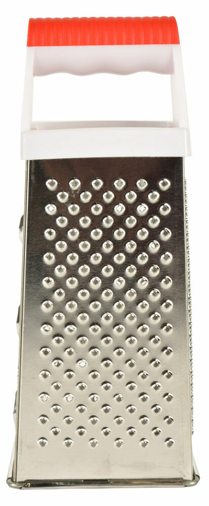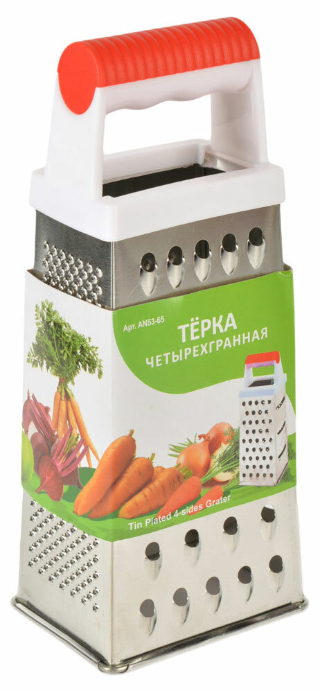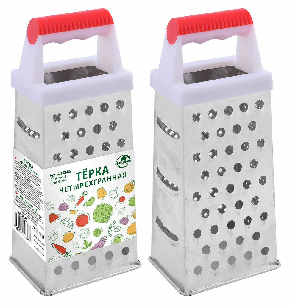 Измельченные продукты кладутся в большое количество блюд — в салаты, супы, выпечку, кондитерские изделия. Часто приходится натирать сыр, морковь, яйца, крутое тесто для пирогов, цедру и многое другое. По двум сторонам изделия расположены крупная и мелкая терки для картофеля, лука, моркови, яиц. Для получения цедры предусмотрены мелкие заостренные отверстия, самые крупные отверстия предназначены для нарезки ломтиками. Чтобы натереть продукты, установите терку на стол и прижмите для устойчивости. Чтобы не повредить пальцы, натирайте только крупные части продуктов. Уход за изделием прост: после использования промывайте водой, удаляя щеткой пищевые отходы.