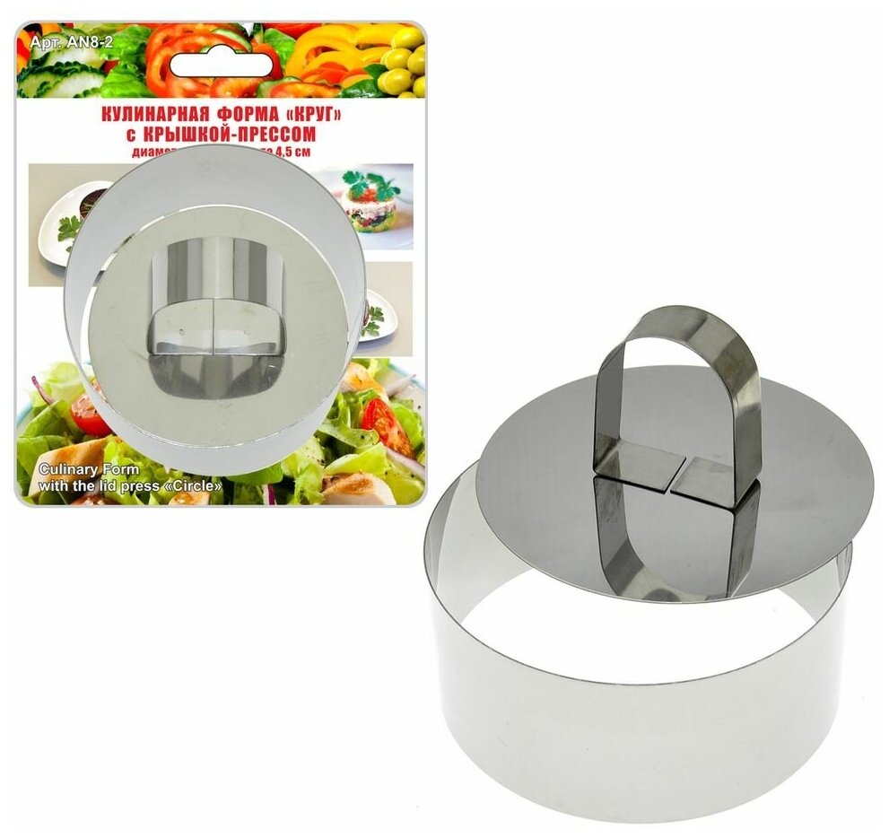Форма кулинарная с крышкой-прессом Мультидом станет отличным помощником в организации праздничного стола. С ней вы легко придадите привычным блюдам аккуратную форму. Используется для сервировки слоенных салатов, закусок и десертов, приготовления омлета и глазуньи, порционного тушения, сборки бутербродов и канапе, вырезания заготовок из теста. Укомплектованный пресс с удобной рукояткой применяется для выталкивания сформованного блюда в тарелку. Основной материал — высококачественная нержавеющая сталь. Прочная и надежная, она длительное время сохраняет остроту, не подвергается коррозии и не влияет на вкусовые качества пищи. Благодаря особому покрытию форма легко извлекается, не нарушая целостность блюда. После применения комплект рекомендуется промыть губкой с использованием жидких моющих средств.
