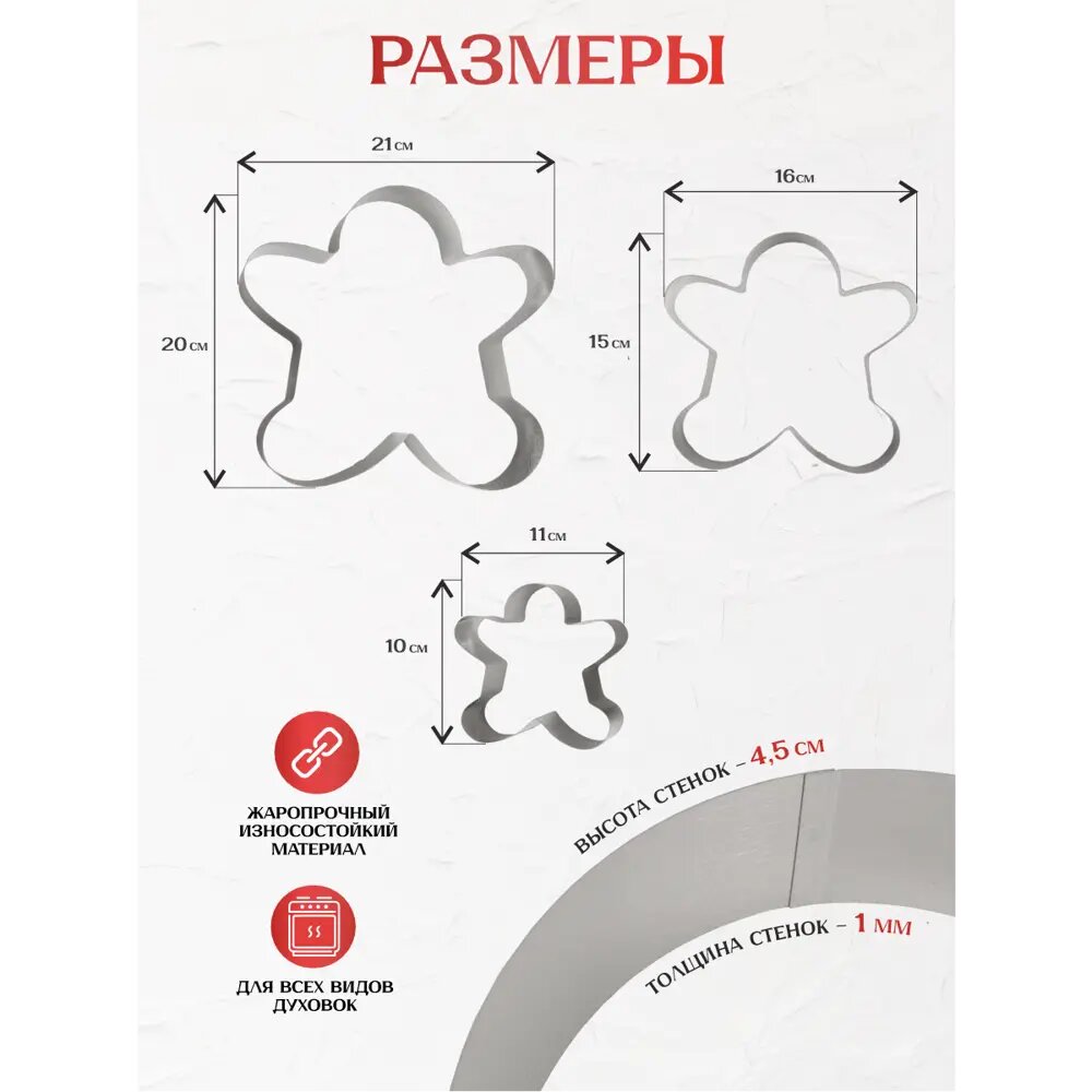 С набором кулинарных форм разного размера, Вы сможете в домашних условиях приготовить имбирные пряники в форме полюбившегося всем человечка! Привлекайте к творчеству детей, вместе украсив, получившиеся пряники. Используйте для выпечки Ваши любимые рецепты имбирных пряников и печенья.
