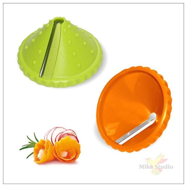 Декоратор для овощей работает по принципу точилки для карандаша. Углубление в виде конусной воронки обеспечивает оптимальный контакт плода с лезвием, что позволяет использовать инструмент для овощей продолговатой формыразного диаметра таких как огурец, морковь и др.