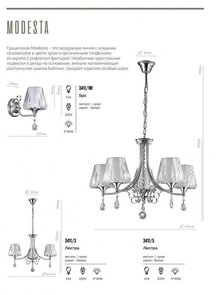 | Описание серии для сайта | Грациозная линия Modesta - это воздушная линия с изящным основанием в цвете хром и органичными плафонами из акрила с рифленой фактурой. Хрустальные подвески и декор на основании придают изделию еще больше шарма. |