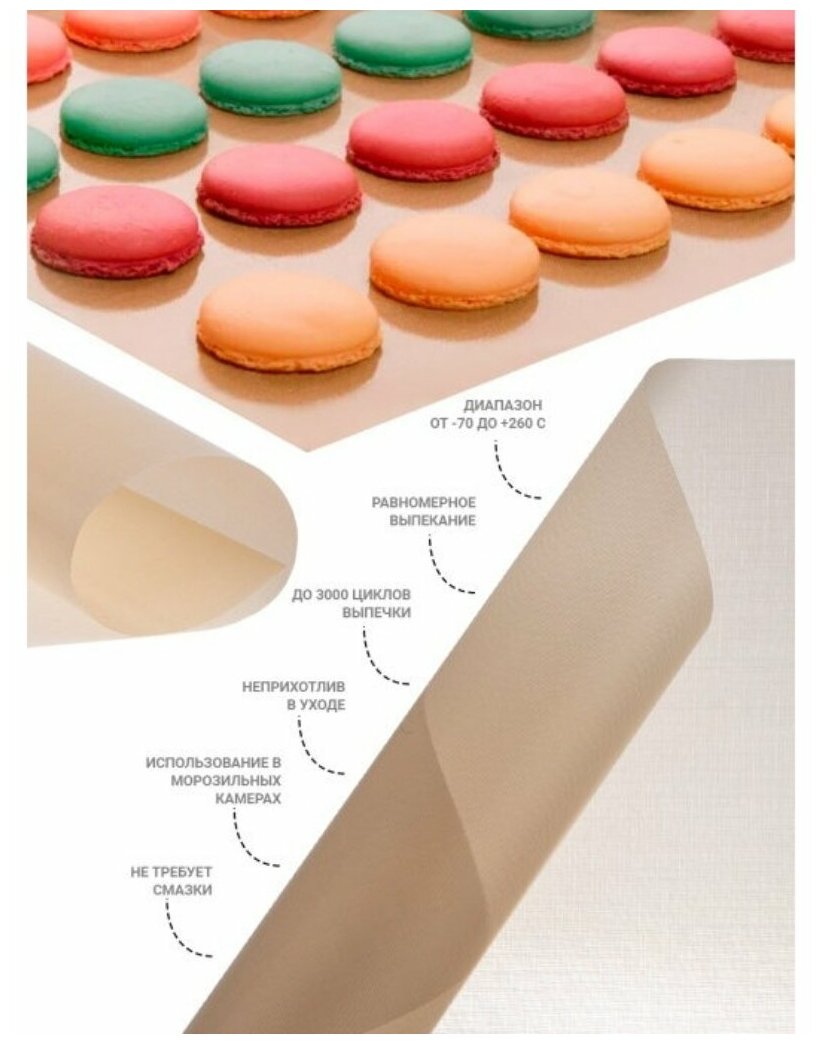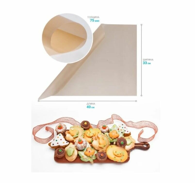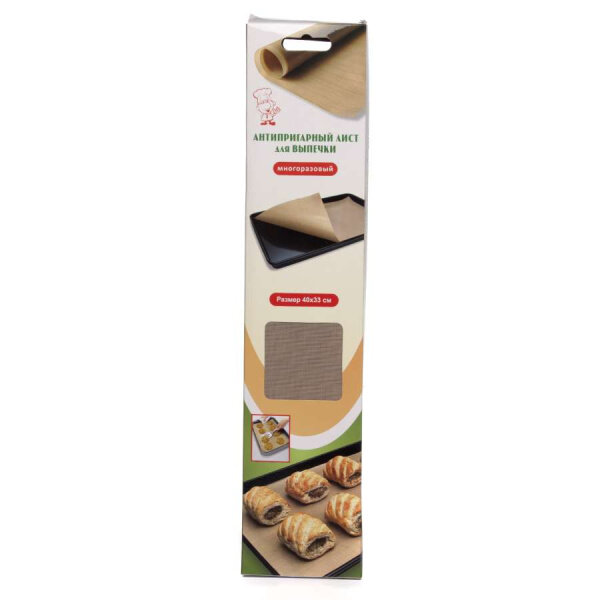 Предназначен для выпечки в духовках электрических и газовых плит, СВЧ-печей. Используется для приготовления пищи в посуде, как в духовках, так и на варочной панели. Исключает прилипание и пригорание пищи. Антипригарный лист полностью исключает возможность прилипания выпечки к противню, исключает применение масла. Возможна раскатка теста на полотне антипригарного листа, также можно использовать для заморозки продуктов в морозильной камере. Легко моется водой с любым жидким моющим средством и мягкой губкой, не впитывает запахи. Изделие выполнено из тефлонового листа, армированного стекловолокном. Используемый в производстве тефлон выдерживает температуру до 260 С, безопасен для контакта с пищевыми продуктами, а также позволяет готовить без использования масла так как обладает отличными антипригарными свойствами. Стекловолокно находится внутри тефлона делая лист более прочным и долговечным при этом не влияет на гибкость листа и не контактирует с пищей. Состав: тефлон армированный стекловолокном. Имитирует плотную бумагу. ВНИМАНИЕ: Не режьте выпечку ножом на листе. Не используйте абразивные материалы и жесткие щетки, повреждение тефлонового слоя приведет к потере изделия антипригарных свойств.