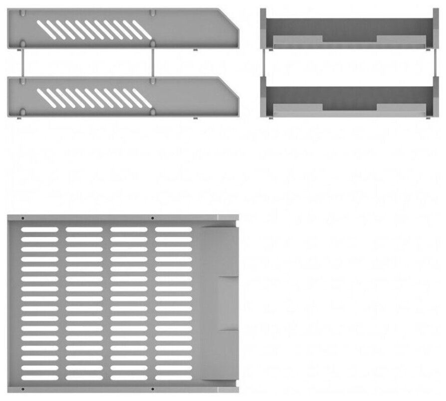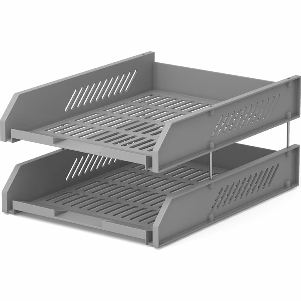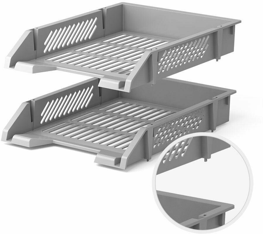 Набор из двух пластиковых лотков, соединенных четырьмя металлическими штифтами. Увеличенное расстояние между лотками создает дополнительные удобства при работе с бумагами. Возможна установка лотков в несколько ярусов. Лотки не скользят и не царапают поверхность стола.