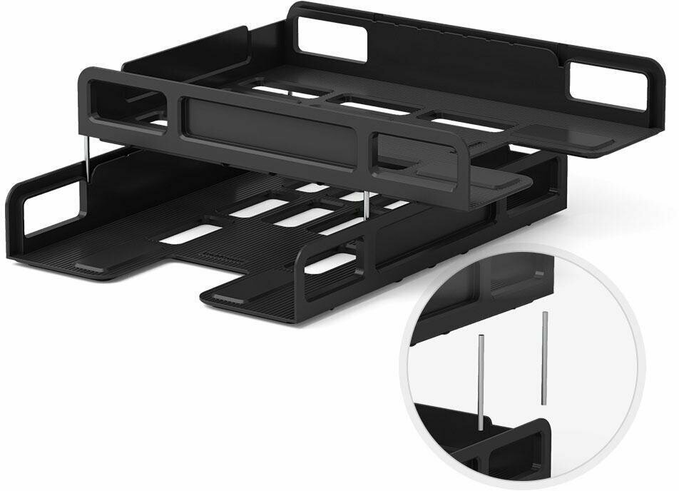Горизонтальные лотки для бумаги Erich Krause Techno предназначены для хранения документов, рабочих бумаг, журналов и каталогов. Набор включает 2 лотка из высококачественного черного пластика. Лотки устанавливаются друг на друга и скрепляются посредством металлических стержней со съемными пластиковыми наконечниками.