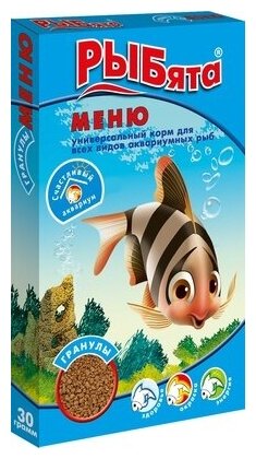 Универсальный корм для всех видов аквариумных рыб (барбусов, меченосцев, гуппи, петушков, гурами и др.) в гранулированном виде.Корм РЫБята МЕНЮ содержит все необходимые компоненты полноценного питания рыбок, в том числе витамины, микро- и макроэлементы. Не замутняет воду.