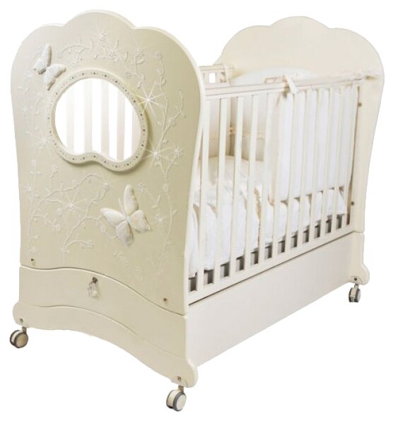 Детская кроватка "Charme Oblo FMS" компании Feretti - высший дизайн для детской спальни. Украшенная нежными цветами и аппликациями в виде бабочек, кроватка создает в комнате малыша атмосферу нежности и легкости. Система Feretti Mystery System (FMS®) - это эксклюзивный маятниковый механизм качания, разработанных фирмой, который позволяет без особых усилий нежно качать ребенка, механизм при этом полностью скрыт. Продольное качание, головка-ножки, полностью повторяет движения мамы.