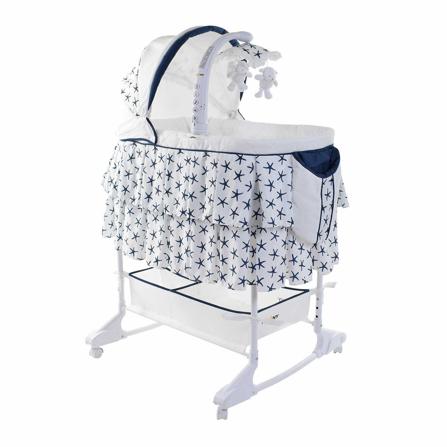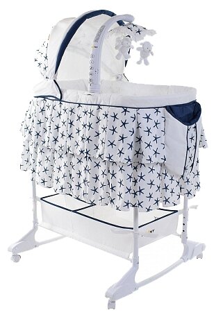 Колыбель NOONY Sea Star – имеет закрытую, уютную конструкцию. Хлопковые натуральные ткани не вызывают аллергии. У колыбельки есть виброблок, который создает микромассаж и расслабляет ребенка. Встроенный мобиль с мягкими игрушками и музыкальным проигрывателем для развлечения малыша. К проигрывателю можно подключать свой мp-3 плеер. Подсветка поможет проверить дитя в сумерках, не включая большой свет. Уровень ложа устанавливается в 3-х положениях, что позволяет настроить кроватку под рост мамы. Карман на покрытых тканью бортиках служит местом хранения для игрушек и прочих небольших вещей. Капор защищает от утреннего солнышка. Внизу расположена сетчатая корзина для белья. Колесики со стопорами позволяют бесшумно перемещать колыбель по комнате. Предназначена колыбель малышам от 0 до 5 месяцев весом не более 7 килограмм. В комплекте также представлен мягкий матрасик.