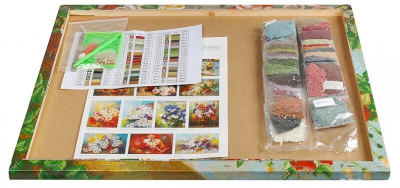 | Комплектация | дополнительный тюбик клея - 1 шт; комплект квадратных камней - 1 шт; крепления для подвеса на стену - 1 шт; листовка-ключ к схеме - 1 шт; листовка о художнике - 1 шт; пинцет металлический - 1 шт; пластмассовый лоток с ячейками - 1 шт; холст с нанесенной схемой на подрамнике - 1 шт |