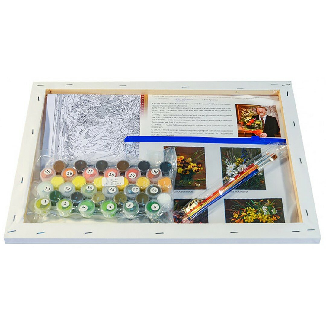 | Состав набора | холст на подрамнике с нанесенным рисунком, контрольный лист с нанесенной схемой, набор акриловых красок, кисти – 3 шт., крепление для готовой картины |