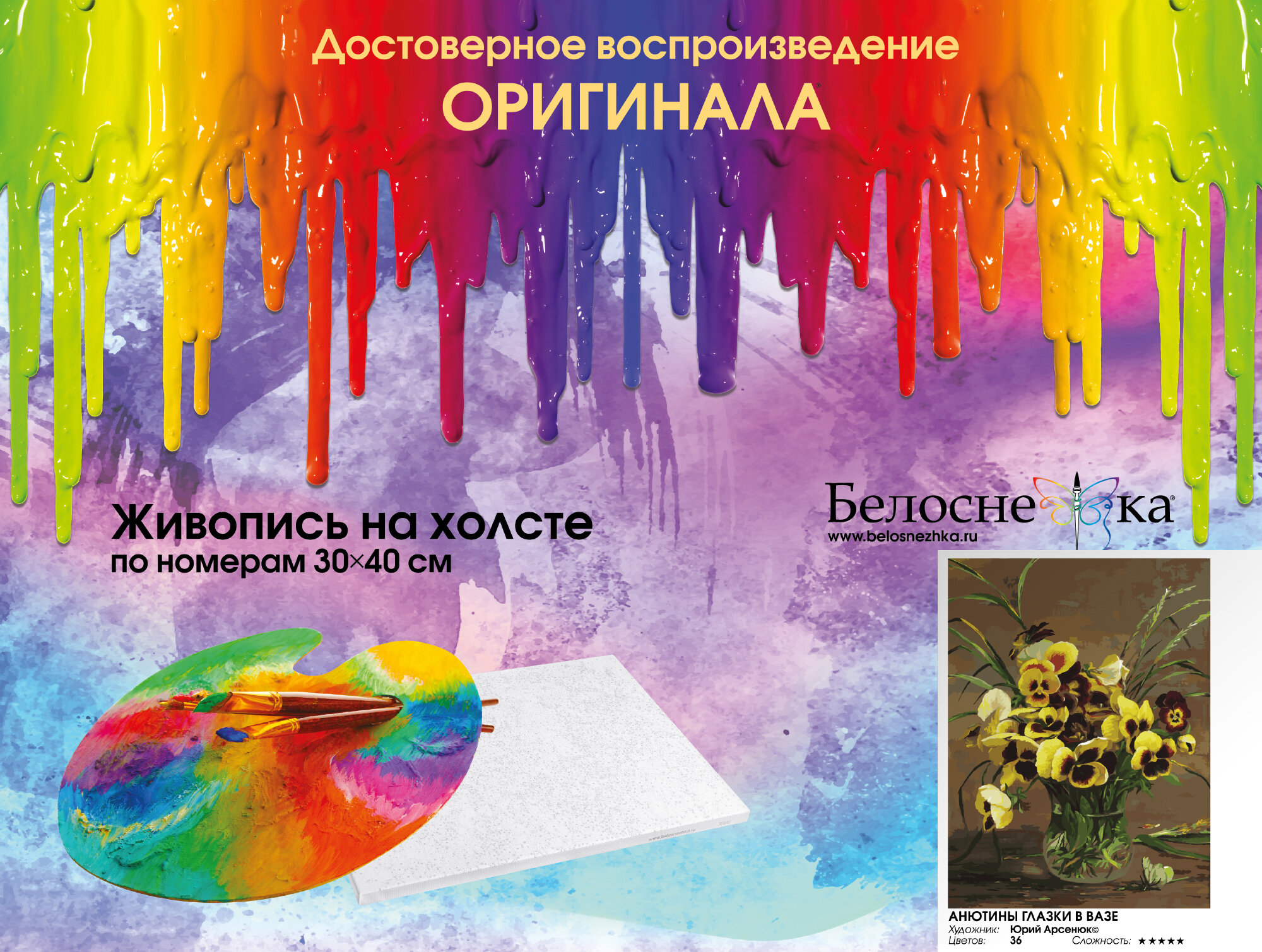 Живопись на холсте Белоснежка "Анютины глазки в вазе" - это набор для раскрашивания по номерам акриловыми красками на холсте. По картине Юрия Арсенюка. В набор входят: - холст на подрамнике с нанесенным рисунком, - пробный лист с нанесенным рисунком, - набор акриловых красок, - 3 кисти, - настенное крепление для готовой картины. Каждая краска имеет свой номер, соответствующий номеру на картинке. Нужно только аккуратно нанести необходимую краску на отмеченный для нее участок.