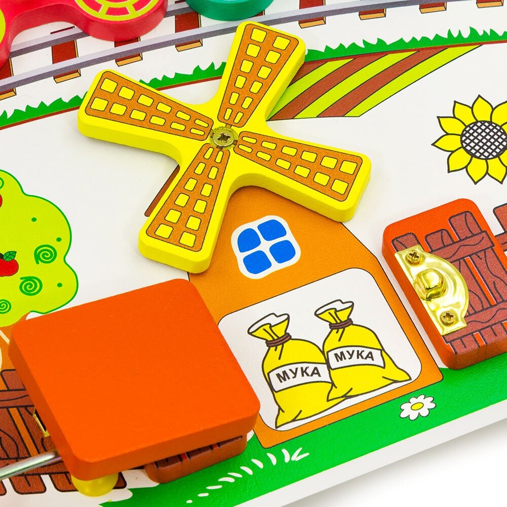Развивающая доска бизиборд "Вагончики" ALATOYS – это обучающая игрушка на основе методики Монтессори. Лёгкая прямоугольная доска из прочной берёзовой фанеры имеет на своей поверхности несколько открывающихся окошек. В каждом из окошек скрывается какая-нибудь картинка. Все окошки закрыты на разные безопасные замочки. Открывайте замочки на дверцах бизиборда и узнайте, кто из зверюшек едет в поезде, в каком вагончике их багаж, кто живёт в домике и что хранится на мельнице.