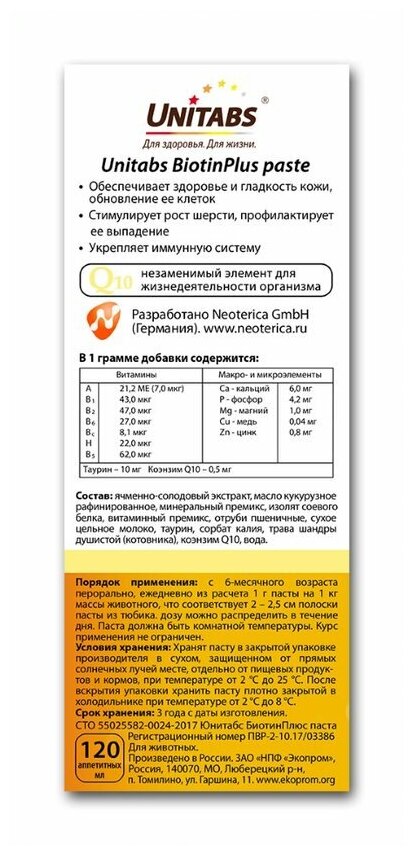 Unitabs – это серия витаминно-минеральных комплексов для собак всех возрастов и пород, которые содержат коэнзим Q10 и все необходимые витамины, макро- и микроэлементы. BiotinPlus с биотином и таурином для кошек, 120 таб. Обеспечивает здоровье и гладкость кожи, обновление ее клеток. Стимулирует рост шерсти, профилактирует ее выпадение.
