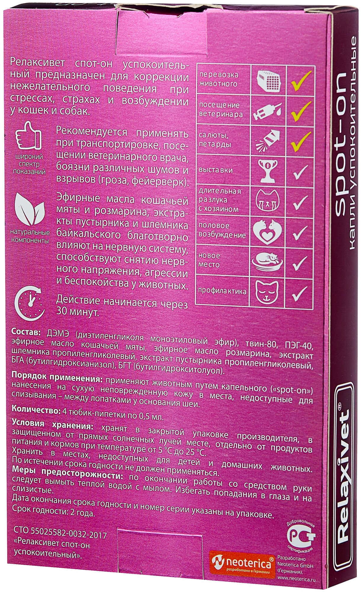Успокоительные Капли на холку Спот-он быстрого действия. Оптимально использовать при:Страхе громких звуковТранспортировкеПосещении ветеринараДействие начинается через 30 минут и длится до 2-х дней.1 пипетка на 5 кг, в упаковке 4 пипетки.Содержат эфирные масла розмарина, кошачьей мяты, экстракты шлемника, пустырника. Благотворно влияют на нервную систему, способствуют снятию нервного напряжения и беспокойства у животных, особенно при боязни громких шумов и взрывов.Абсолютно безопасны и не вызывают привыкания даже при длительном применении. Натуральные компоненты, против стресса.