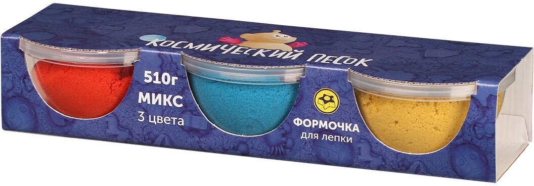 Космический песок "Микс" - удивительный материал, предназначенный для детских игр и творчества. Он очень приятен на ощупь, не липнет к рукам, хорошо лепится. В его состав входят экологически чистые материалы: кварцевый песок и полимеры. Набор включает в себя песок красного, желтого и голубого цветов, а также формочку для лепки.