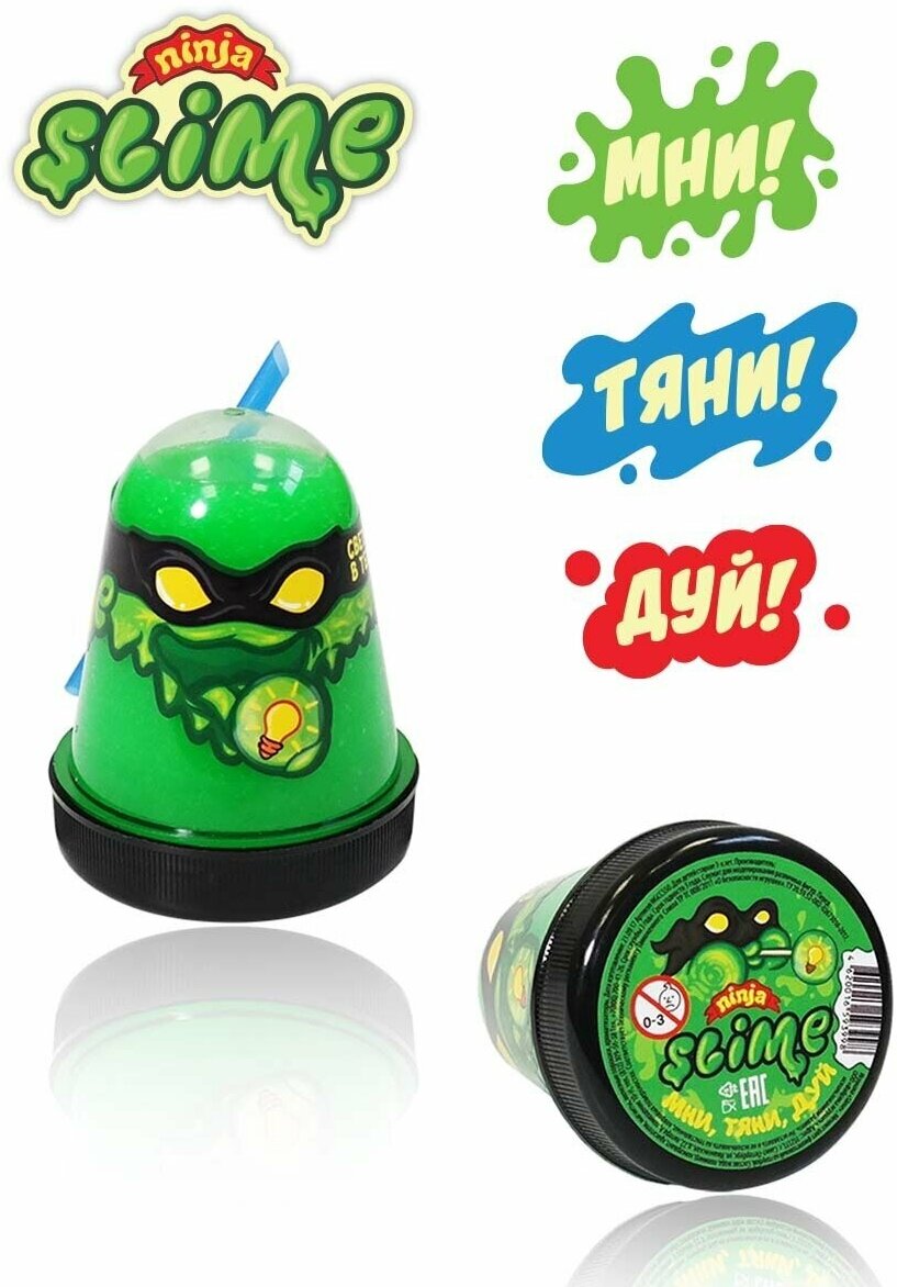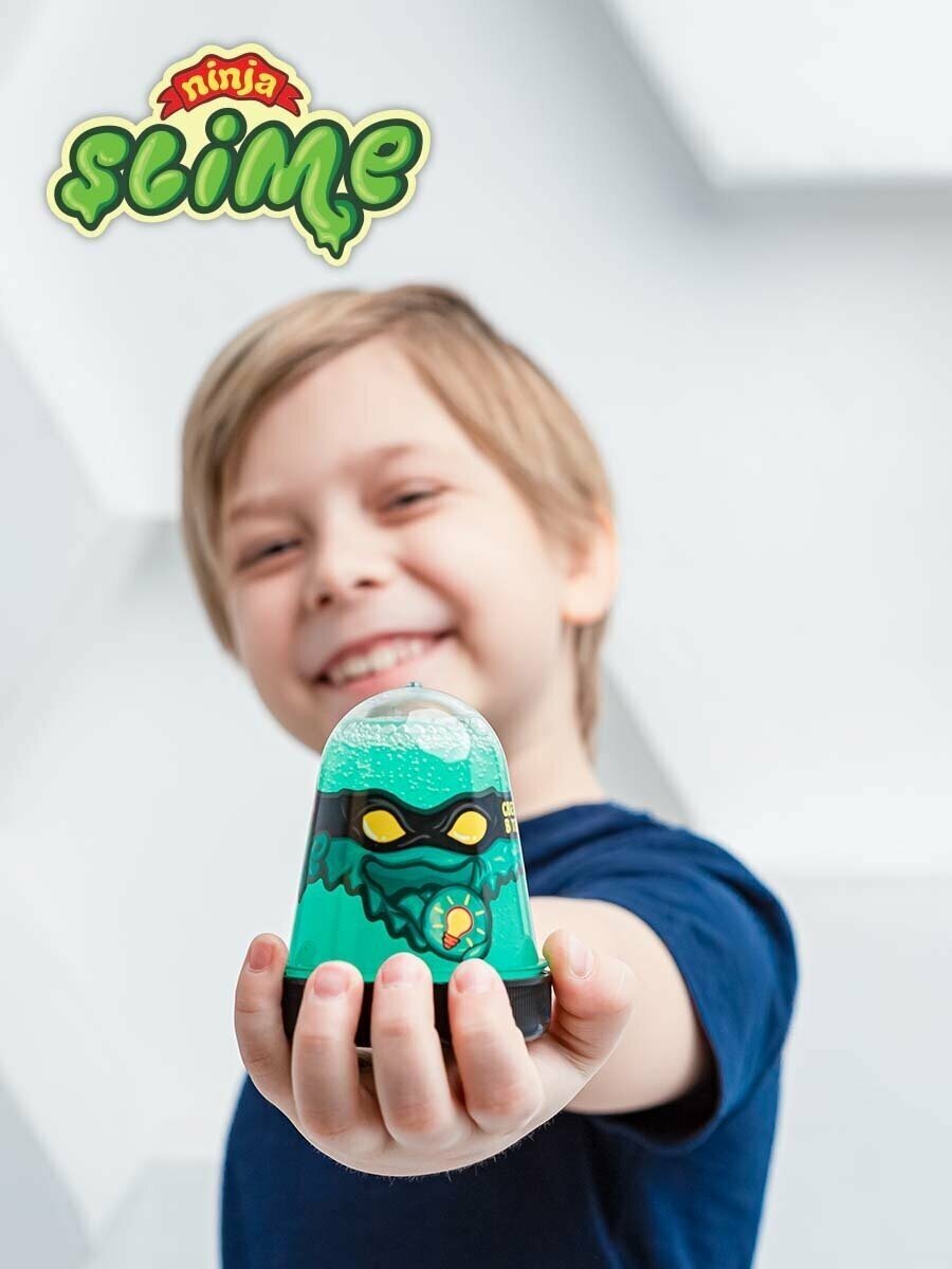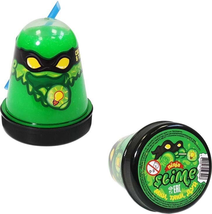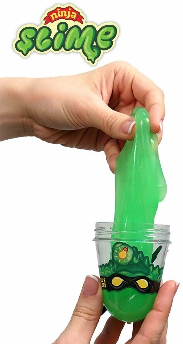 Ninja Slime - это необыкновенный лизун, наделенный суперсилой, пластичностью и эластичностью. Из него можно выдувать пузыри, используя трубочку из набора. Если растянуть Slime и поставить под струю воды, завернув уголки, то он сможет держать жидкость как шарик.