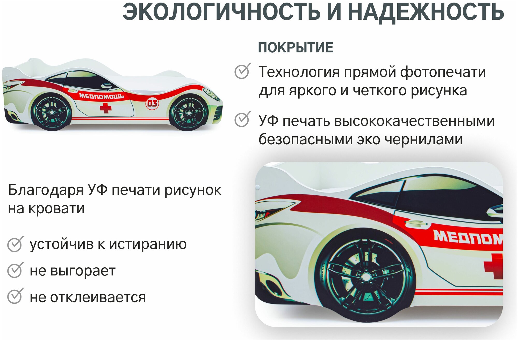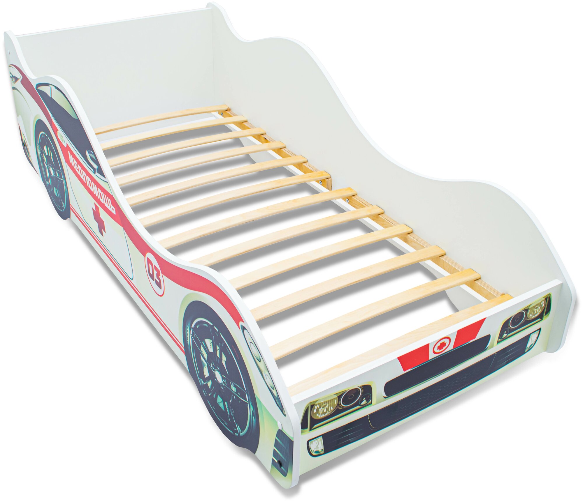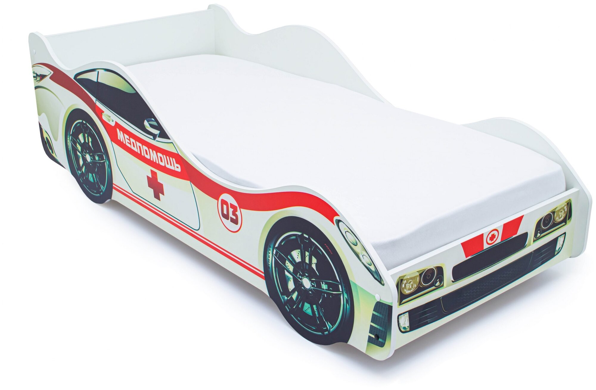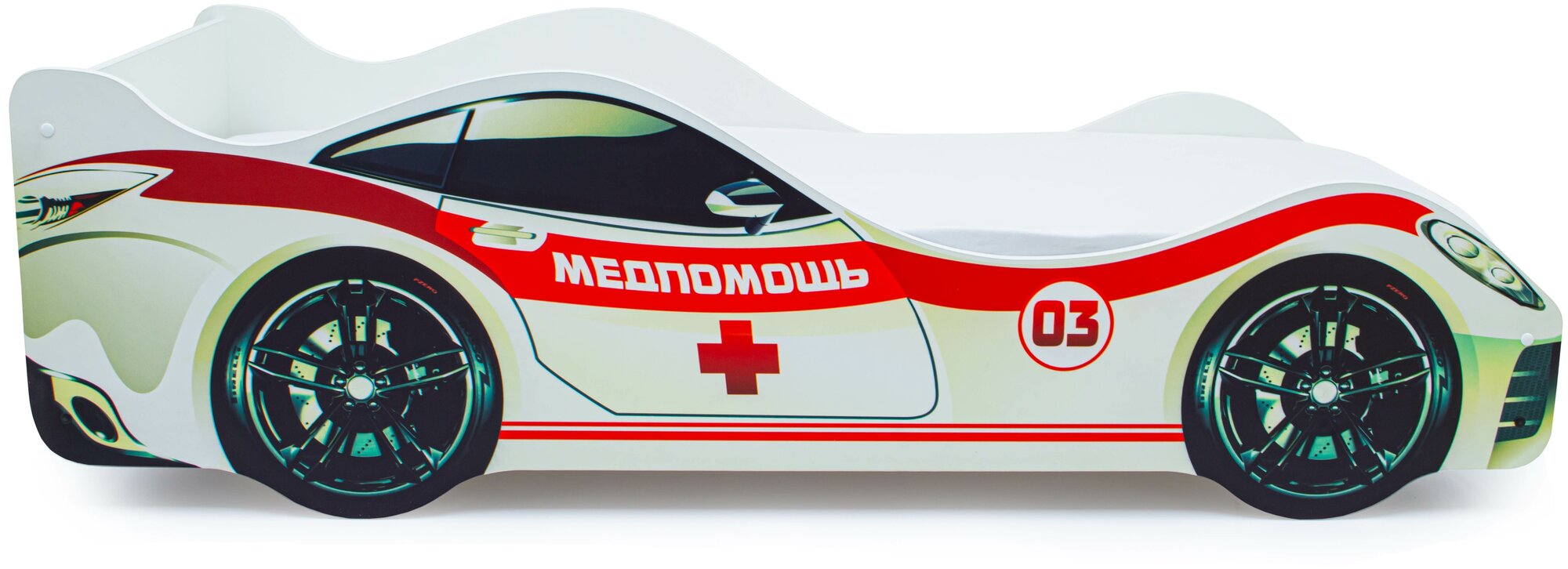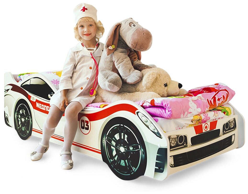 Медпомощь – это предназначенная для мальчиков и девочек от 2-х лет кровать-машинка, на которой можно организовать увлекательные игры. Дети превратили спальное место в батут? Не нужно беспокоиться: наши кроватки не ломаются! Основание изготовлено из прочных деревянных лат, которым не страшна нагрузка до 200 кг, а прочные борта, оклеенные кромкой ПВХ, не дадут ребенку ушибиться. Светлая расцветка модели отлично впишется в интерьер детской комнаты, а уход не составит никакого труда – достаточно протереть борта влажной салфеткой. Изображение нанесено методом УФ-печати и поэтому, не боится даже применения агрессивных моющих средств. Кроме того, краски, применяемые при таком способе печати, безвредны для человека. Мы не используем в производстве вредные материалы и вещества!