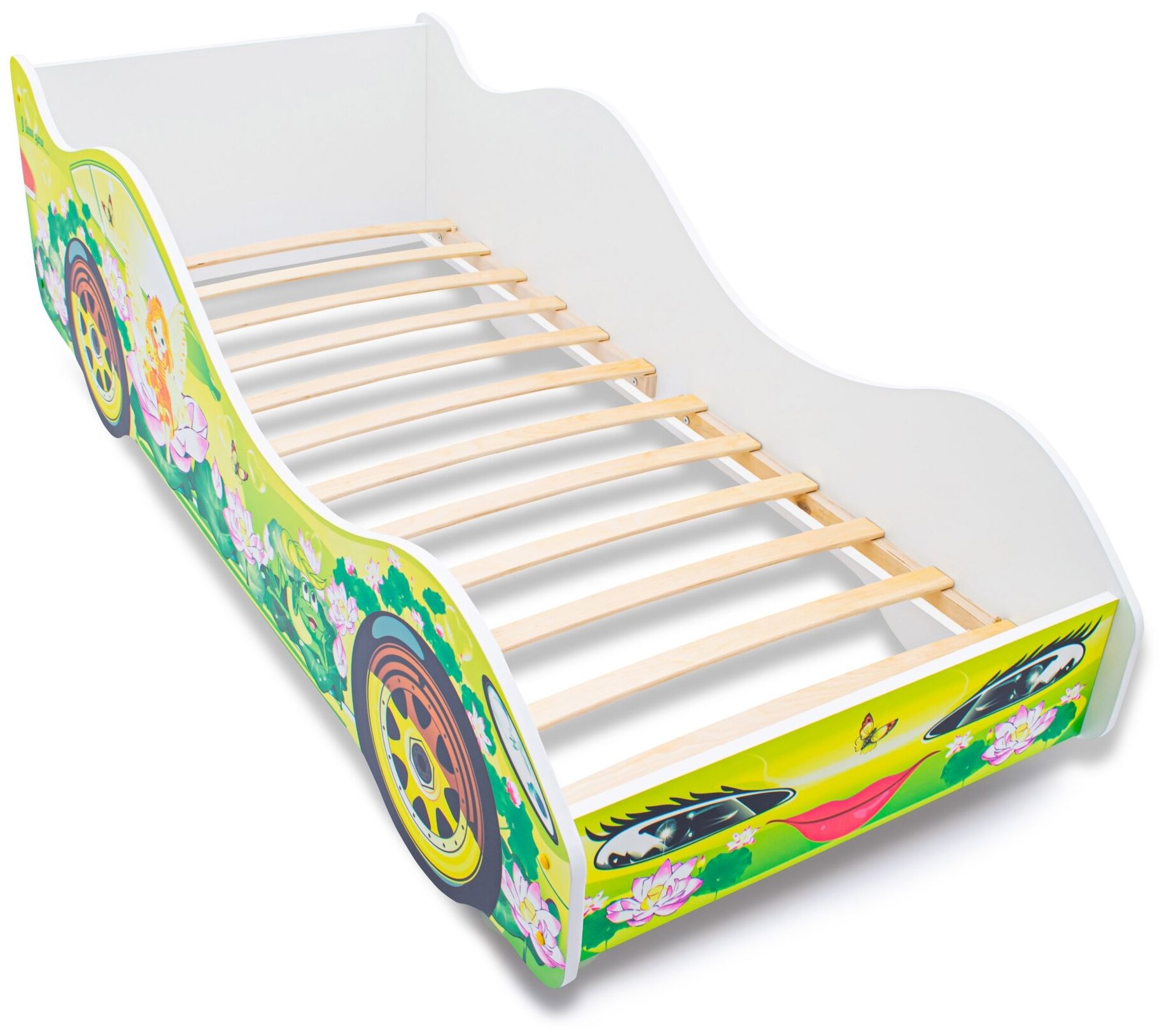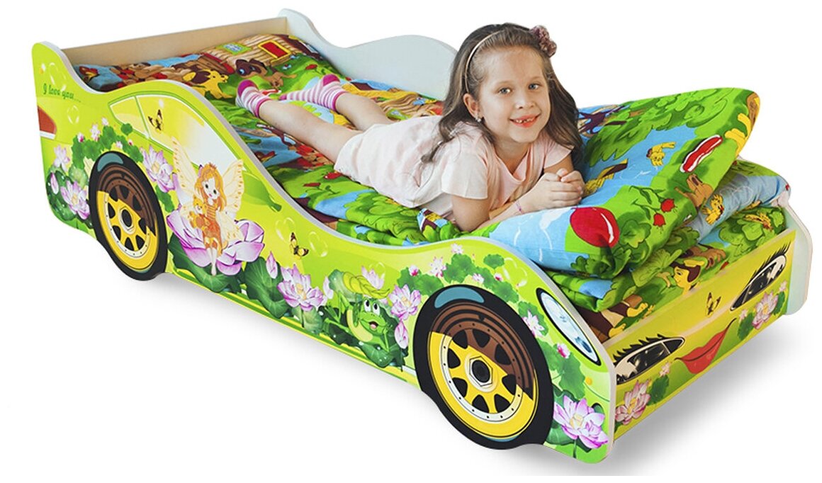 Кто сказал, что машины любят только мальчишки? Конечно же это не так! Поэтому для маленьких красавиц наш магазин предлагает кровать-машинку «Сказка», с замечательным рисунком выполненным в ярких, сочных оттенках. Изображение нанесено способом прямой фотопечати, что говорит о его высоком качестве с отличной детализацией, кроме того, такой метод – один из самых экологичных и безвредных для здоровья. Для изготовления кровати были использованы только безопасные материалы, такие как натуральное дерево и ЛДСП класса Е1, предназначенного для детских изделий. Конструкция имеет бортик, который не позволит ребенку упасть во сне или во время игр. Дополнительно предлагаем оборудовать машинку колесами и подсветкой, которая может выполнять функции ночника. А также у нас можно приобрести матрас и красивое постельное белье, которое добавит уюта. Какие сны будут приходить на такой кроватке? Без всякого сомнения – сказочные!