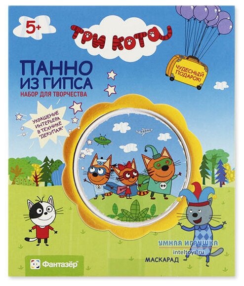 Набор для творчества от бренда Фантазер предлагает ребенку создать гипсовое панно и украсить его рисунком в технике декупаж. Рисунок представляет собой картинку под названием Маскарад, на которой изображены герои мультсериала Три кота. Данный творческий процесс состоит из нескольких этапов. Для начала изготавливается гипсовая форма, затем на нее накладывается декупажная карта и хорошо проклеивается. Чтобы придать гипсовому изделию яркости, в наборе предусмотрены баночка желтой краски и кисть. Размер панно: 12 х 12 см.