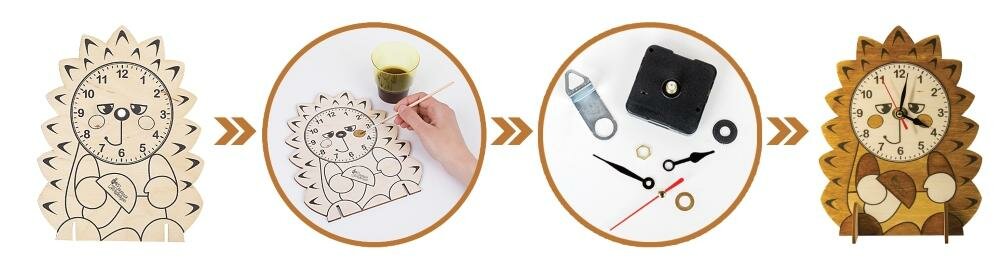 Прежде, чем приступить к сборке часов, ребенку придется разукрасить «Ёжика» водорастворимым красителем. В зависимости от количества слоев тонера (от 1 до 4-х) меняется оттенок древесины, рисунок приобретает необходимый тон, контрастность и выразительность. Схема слоев тонировки можно увидеть на упаковке. Последующие слои тонировки наносить после полного высыхания предыдущего. Если ребенок не имеет достаточного опыта сборки, то установку часового механизма лучше выполнять с помощью или под контролем родителей. Особое внимание нужно уделить установке стрелок. Подробно установка часового механизма описана в прилагаемой к набору инструкции. Теперь, что бы часы заработали, нужно, соблюдая полярность, вставить батарейку «АА» (в комплект не входят) и выставить точное время. Готовые деревянные часы «Ёжик» можно поставить на полку или повесить на стену.