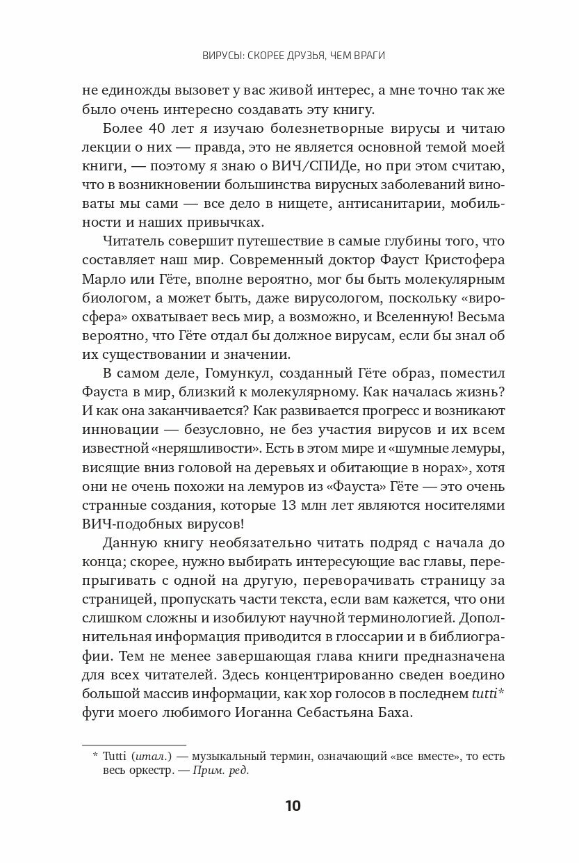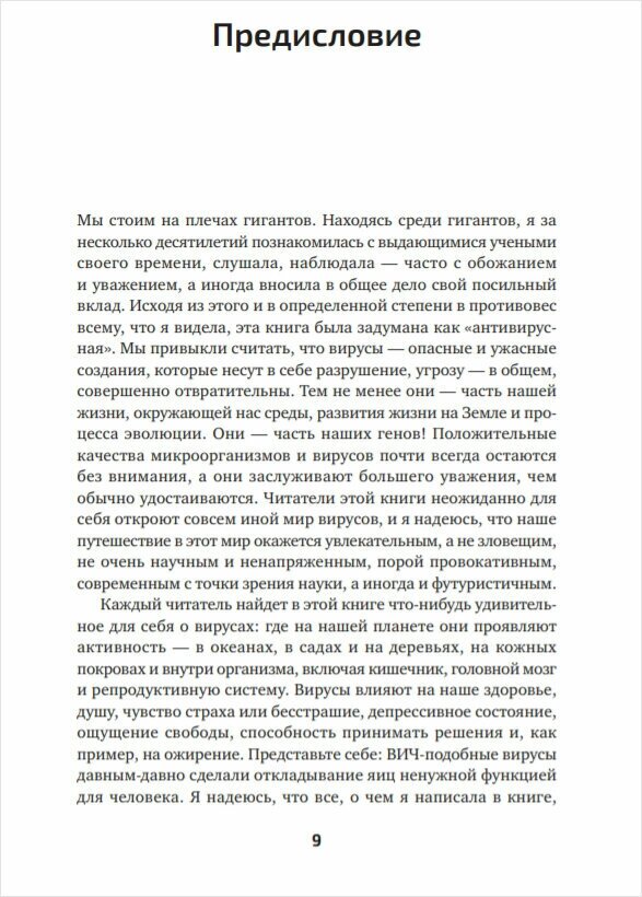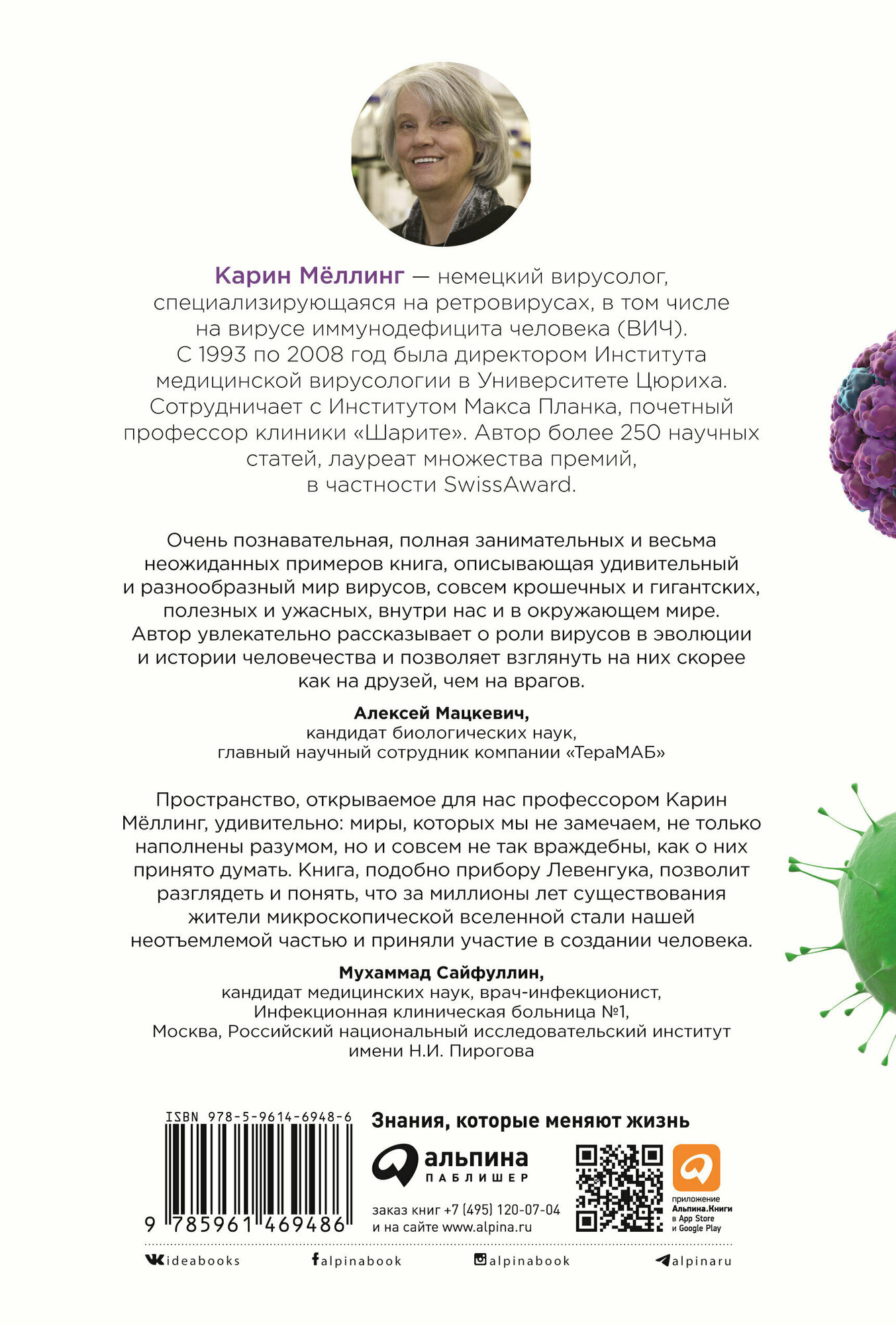 Грипп, ВИЧ, Эбола - мы привыкли думать, что вирусы несут нам только угрозу. Но на самом деле большинство вирусов безвредны; более того, они наши незаменимые помощники. Вирусы есть повсюду: в воздухе, растениях и животных, внутри нас самих и даже на нашей коже. Они борются с бактериями, влияют на погоду, наше самочувствие и настроение, могут способствовать ожирению или лечить от него. Вирусы - часть нашего генома! Они помогли нам стать теми, кто мы есть. Известная вирусолог Карин Мёллинг описывает невероятный и мало знакомый нам мир вирусов. Из книги вы узнаете о прошлом вирусов, о том, как они помогали людям эволюционировать, и о том, как мы можем использовать их в будущем.