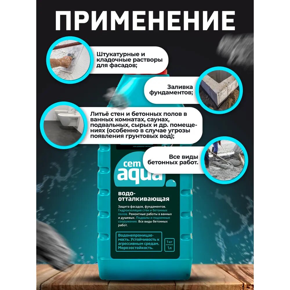 Гидрофобизатор CemAqua при добавлении в раствор глубоко проникает по всему объему, придает сооружениям из бетона и штукатуренным поверхностям водоотталкивающие свойства, защищает их от влаги, пыли, грязи, высолов, плесени и промерзания. Комплекс полимеров снижает теплопроводность, увеличивает устойчивость к коррозии, экономит цемент. Водоотталкивающую добавку рекомендуется использовать для штукатурных и кладочных растворов, заливки фундамента, литья стен и полов, особенно в помещениях с повышенной влажностью.