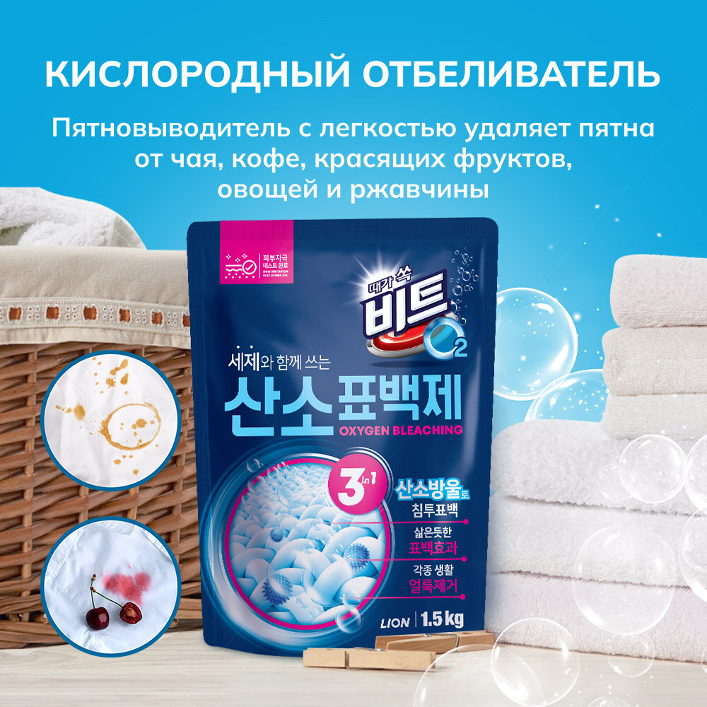 Профессионал в сфере отбеливания! Создан по технологии Beat усовершенствованный отбеливатель Beat О2!Нет грязи места-Профессионал в сфере отбеливания!Придаёт белизну белым вещам и яркость цветным. Дезинфицирующий эффект на 99,9%. Функция выведения пятен. Антиплесневой эффект (Anti-mold Effect). Предотвращает распространение плесени внутри стирального бака, преграждает попадание плесени в воду для стирки. Отбеливатель санитарно-гигиенический.
