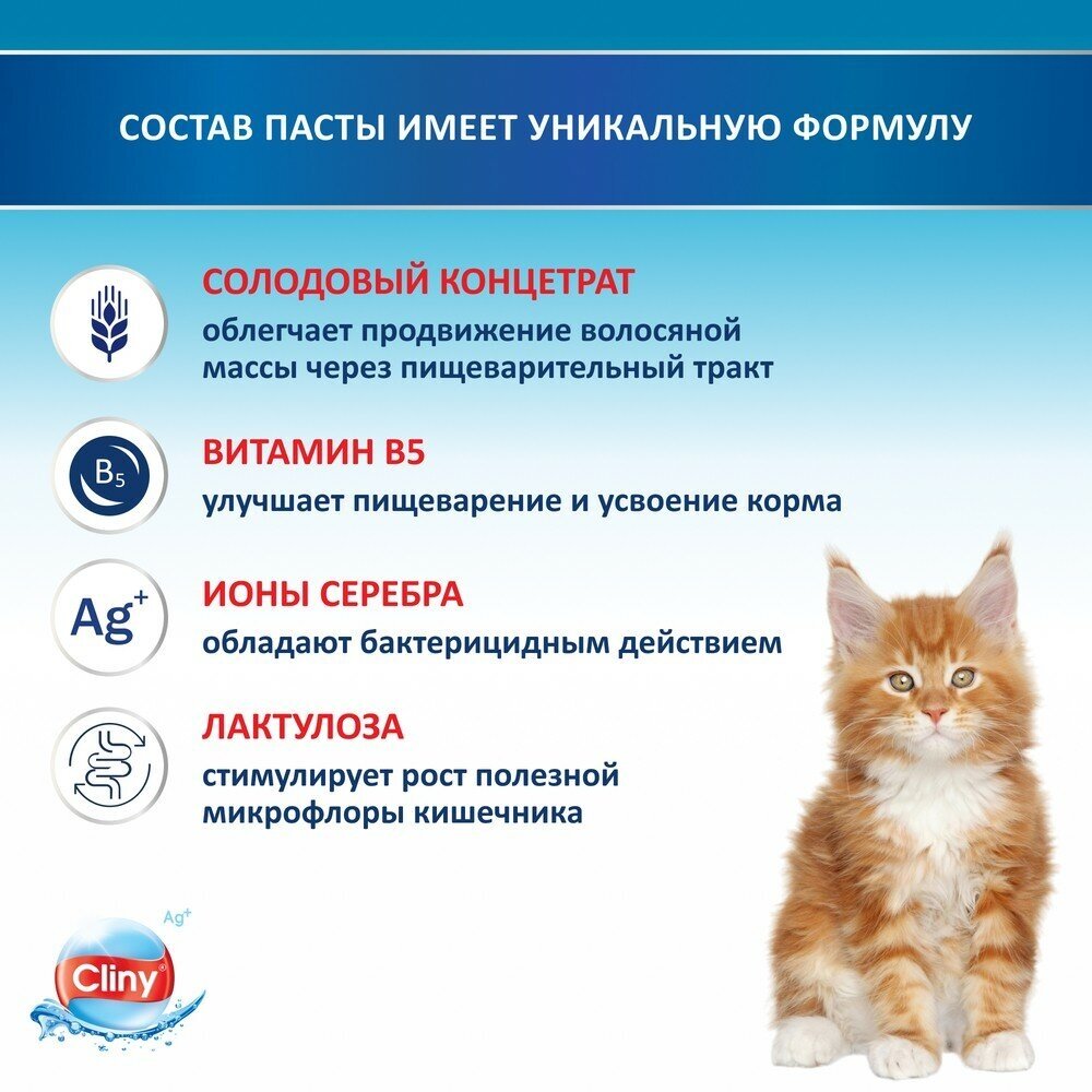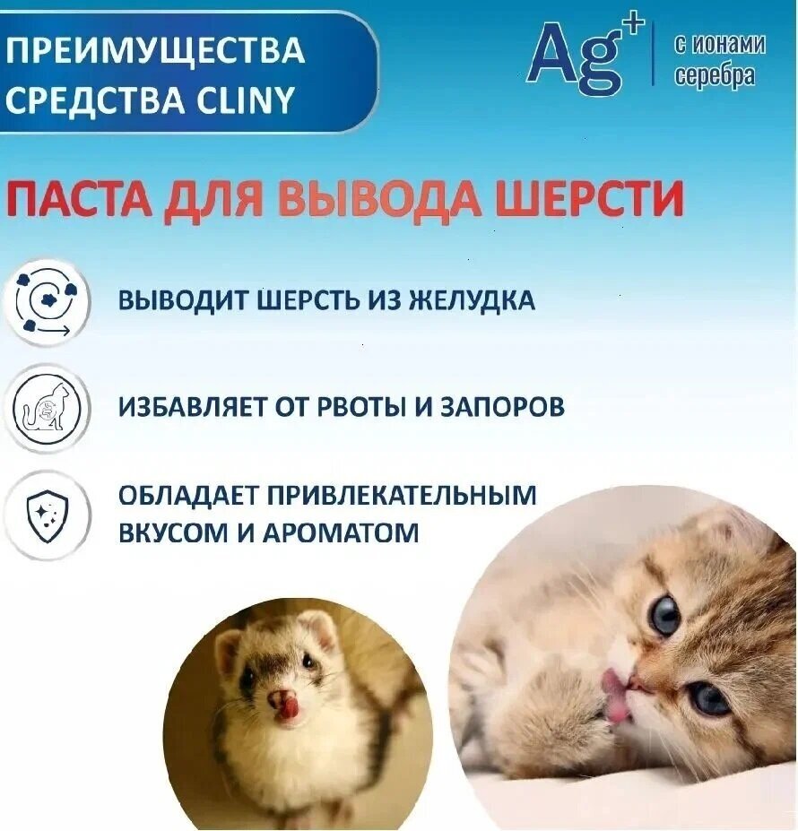 "Паста для вывода шерсти Cliny способствует естественному выведению комков шерсти (безоаров) из желудка животных. Избавляет кошек от рвоты, потери аппетита, закупорки кишечника, запоров. Обладает привлекательным для кошек вкусом и ароматом солода.Состав пасты имеет уникальную формулу:-Солодовый экстракт смягчает волосяные комки и облегчает продвижение волосяной массы через пищеварительный тракт