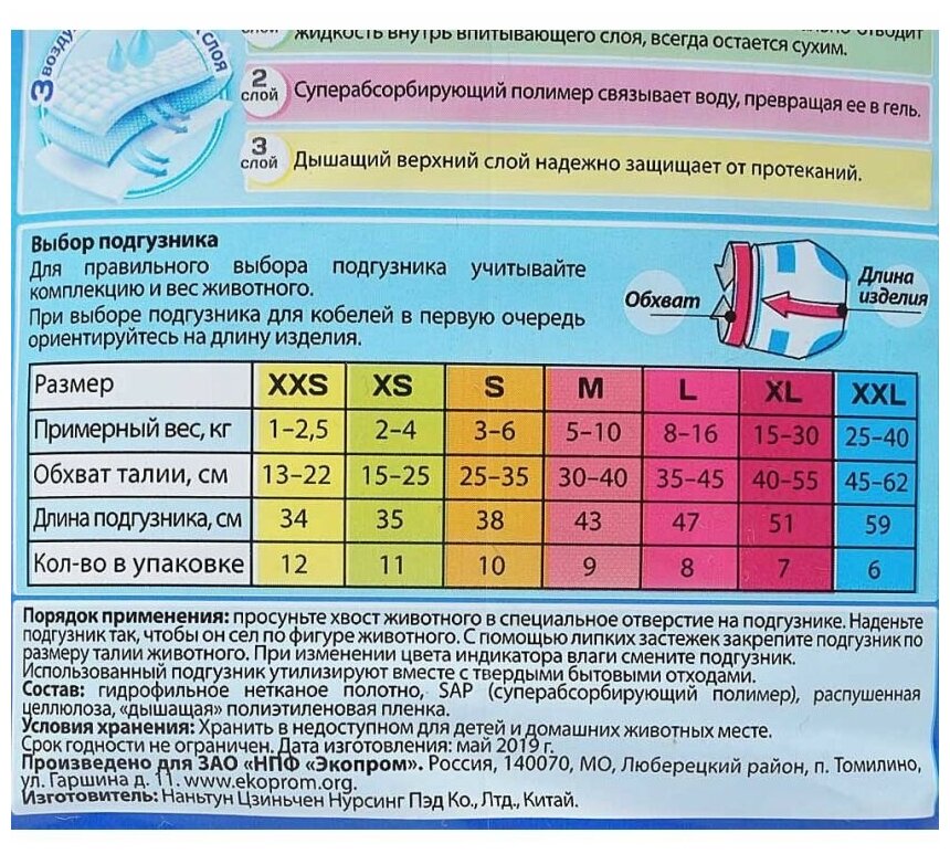 Подгузники впитывающие для домашних животных обеспечивают надежную защиту, гигиену и комфорт. Необходимы домашним животным при недержании, течке, передержке, а также в послеоперационный период и при транспортировке.Анатомическая форма подгузника делает ношение его лёгким и комфортным для животного.Гранулы SAP превращают влагу в гель, надежно удерживают влагу и запахи.СОСТАВ: Гидрофильное нетканое полотно, SAP (супер абсорбирующий полимер), распушенная целлюлоза, дышащая полиэтиленовая пленка.УСЛОВИЯ ХРАНЕНИЯ: Хранить в сухом недоступном для детей и домашних животных месте.Срок годности не ограничен.