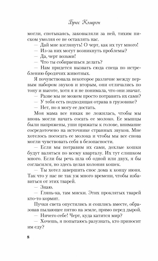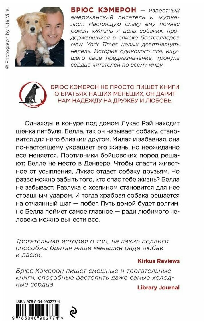Прекрасная книга, написанная в неповторимом стиле Брюса Кэмерона, где повествование ведётся от лица собаки. Это очень трогательная история о собаке, прошедшей более 400 миль в поисках своего хозяина.