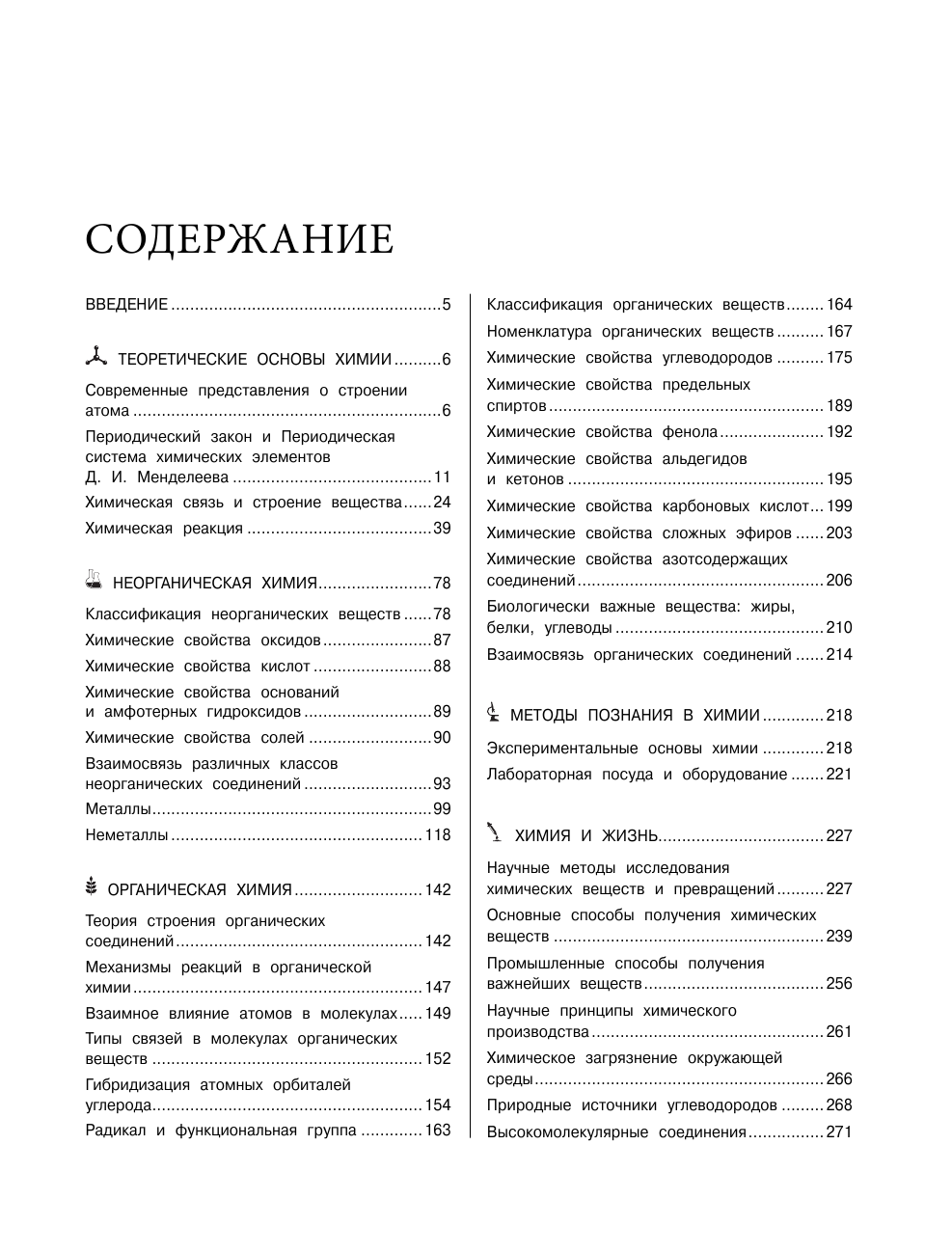 Информация представлена в максимально удобной и эффективной для изучения и запоминания форме — в схемах и таблицах, что обеспечит плодотворную и быструю подготовку к урокам, контрольным и различным экзаменам. В пособии можно найти все основные разделы предмета: «Теоретические основы химии», «Неорганическая химия», «Органическая химия», «Методы познания в химии», «Химия и жизнь», «Расчеты по химическим формулам и уравнениям реакций».