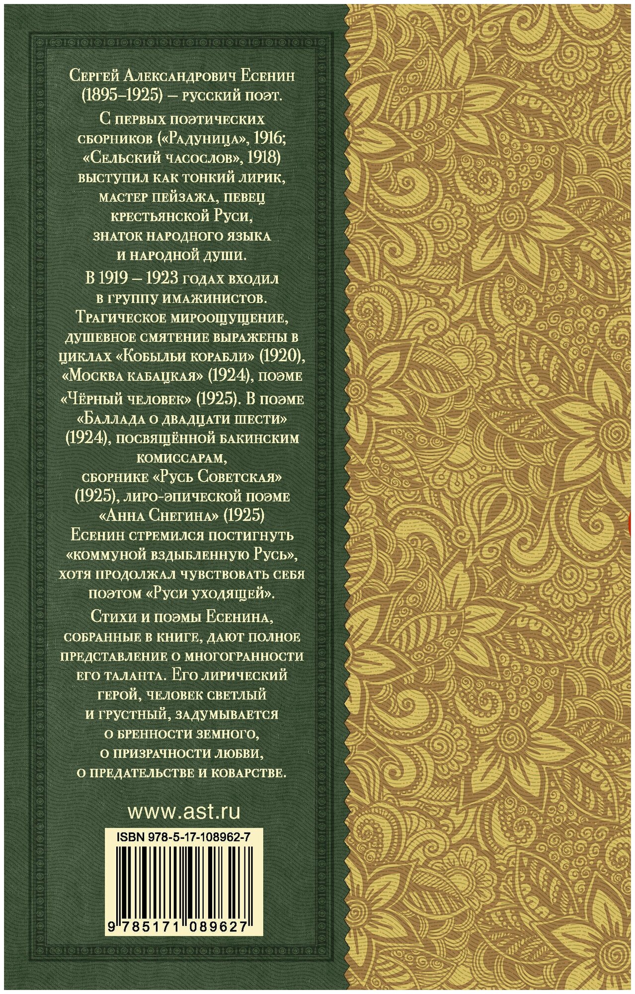 Сергей Александрович Есенин (1895–1925) – русский поэт, представитель крестьянской поэзии и лирики, позже литературного течения – имажинизма. С первых поэтических сборников ("Радуница", 1916, "Сельский часослов", 1918) выступил как тонкий лирик, мастер пейзажа, певец крестьянской Руси, знаток народного языка и народной души. В 1919 – 1923 годах входил в группу имажинистов. Трагическое мироощущение, душевное смятение выражены в циклах "Кобыльи корабли" (1920), "Москва кабацкая" (1924), поэме "Чёрный человек" (1925). В поэме "Баллада о двадцати шести" (1924), посвящённой бакинским комиссарам, сборнике "Русь Советская" (1925), лиро-эпической поэме "Анна Снегина" (1925) Есенин стремился постигнуть "коммуной вздыбленную Русь", хотя продолжал чувствовать себя поэтом "Руси уходящей", "золотой бревенчатой избы". Стихи и поэмы Есенина, собранные в книге, дают полное представление о многогранности таланта поэта. Его лирический герой, человек светлый и грустный, задумывается о бренности земного, о призрачности любви, о предательстве и коварстве. "Клён ты мой опавший…", "Отговорила роща золотая…", "Не жалею, не зову, не плачу…" – строки этих и других стихов Сергея Есенина стали поистине народными и до сих пор тревожат сердца читателей.