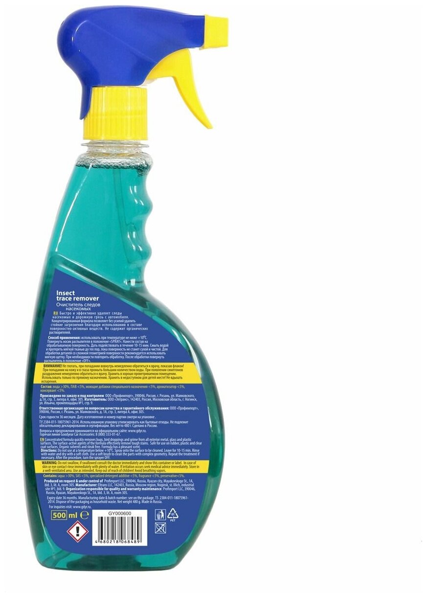 Очиститель следов насекомых от Goodyear безопасен для лакокрасочного покрытия, легко смывается водой, не оставляя разводов. Средство обладает приятным ароматом.
